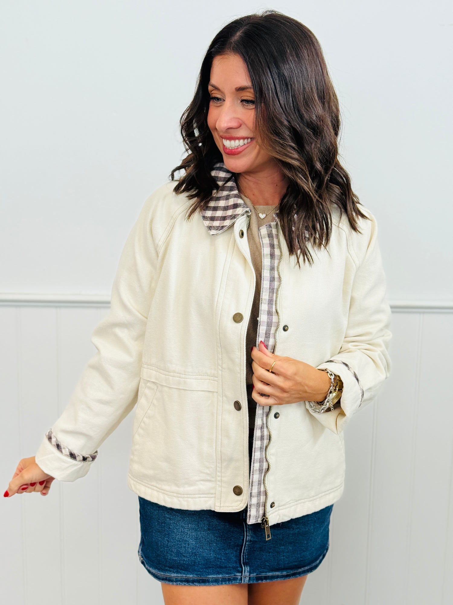 Ecru Plaid Contrast Zip & Snap Jacket (Reg.)