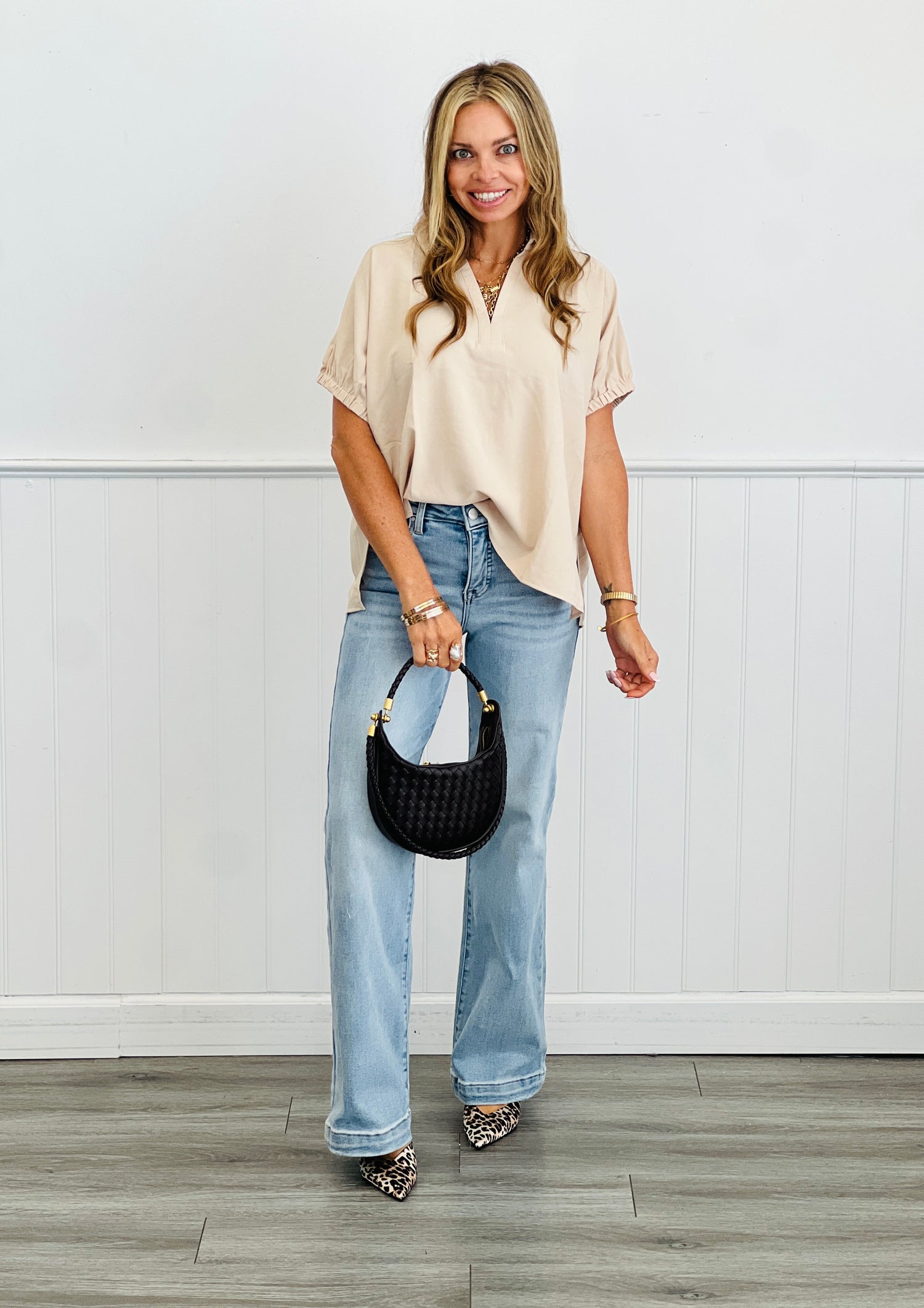 Ecru Short Sleeve Split Collar Top (Reg & Plus)
