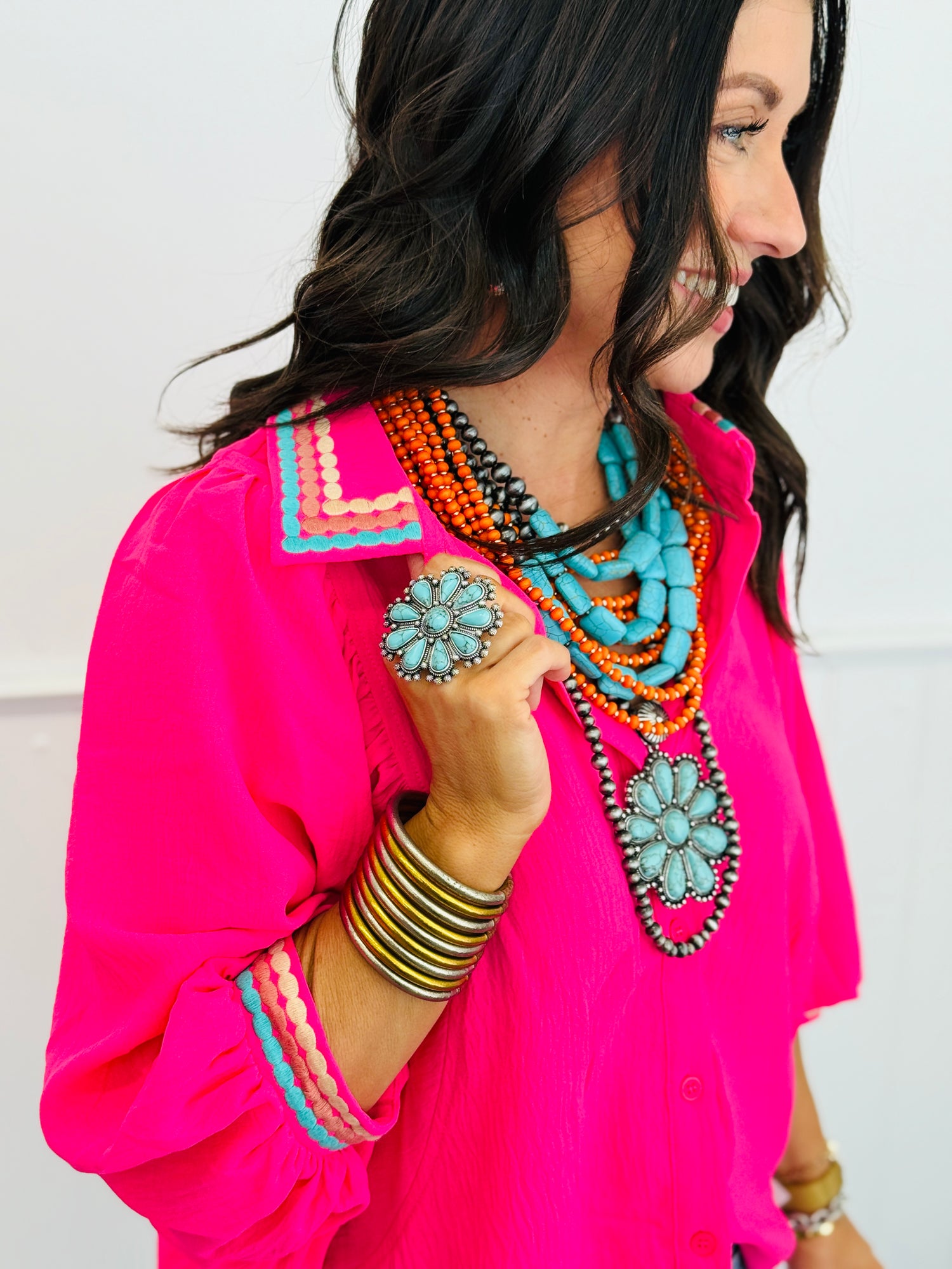 Indulge your love for color with this Electric Fuchsia Embroidered Trim Blouse. Designed with a button-down front, 3/4 puffed sleeves with contrast embroidered trim, an inset collar with embroidered trim and a relaxed fir silhouette.