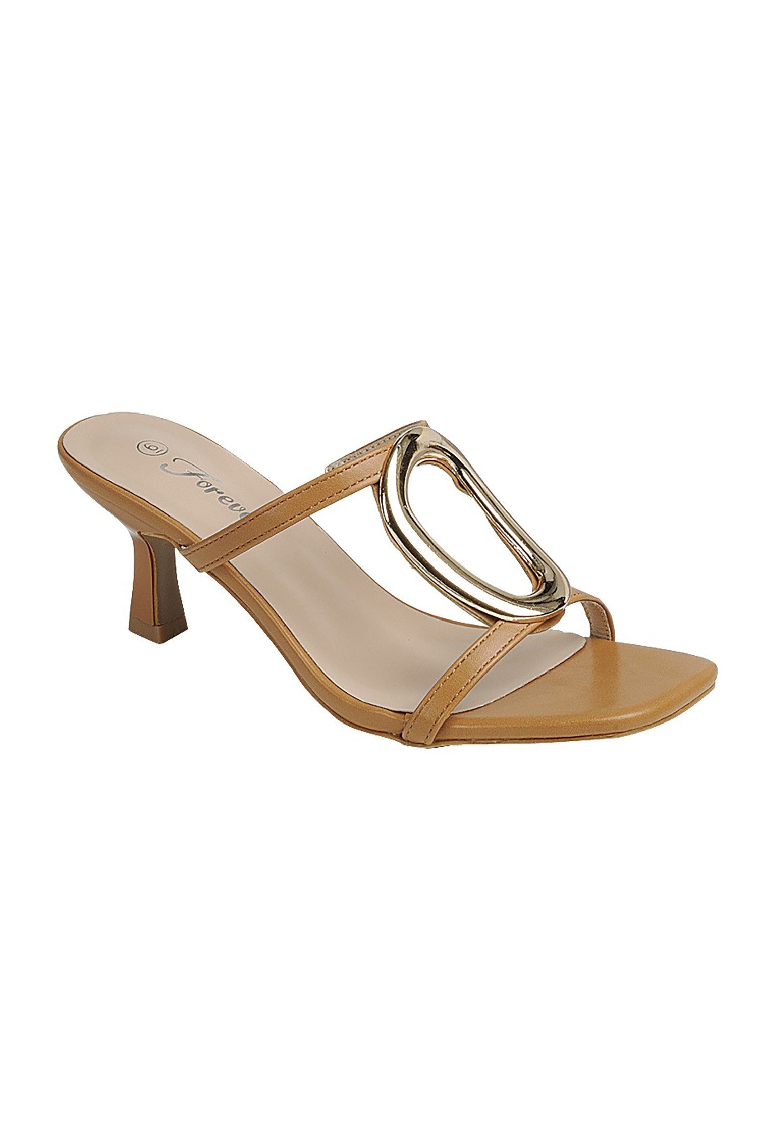 Add some edge and glam to your wardrobe with Tan Go Get 'Em Kitten Heels. These quirky heels feature an edgy square open toe and playful metallic decor. .