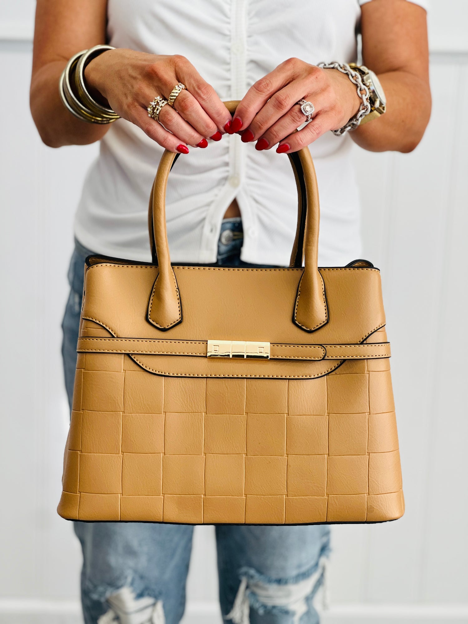 Carry your essentials in style with the Amaya Belted Buckled Satchel—a faux leather stunner that's equal parts chic and practical. The quilted embossed texture brings serious sophistication to your everyday look, while the belt buckle closure keeps everything secure. With three roomy compartments, you'll have space for all your must-haves without sacrificing that polished aesthetic. Available in five gorgeous colors, this satchel is your new go-to for making a fashion statement that actually works as hard as you do.