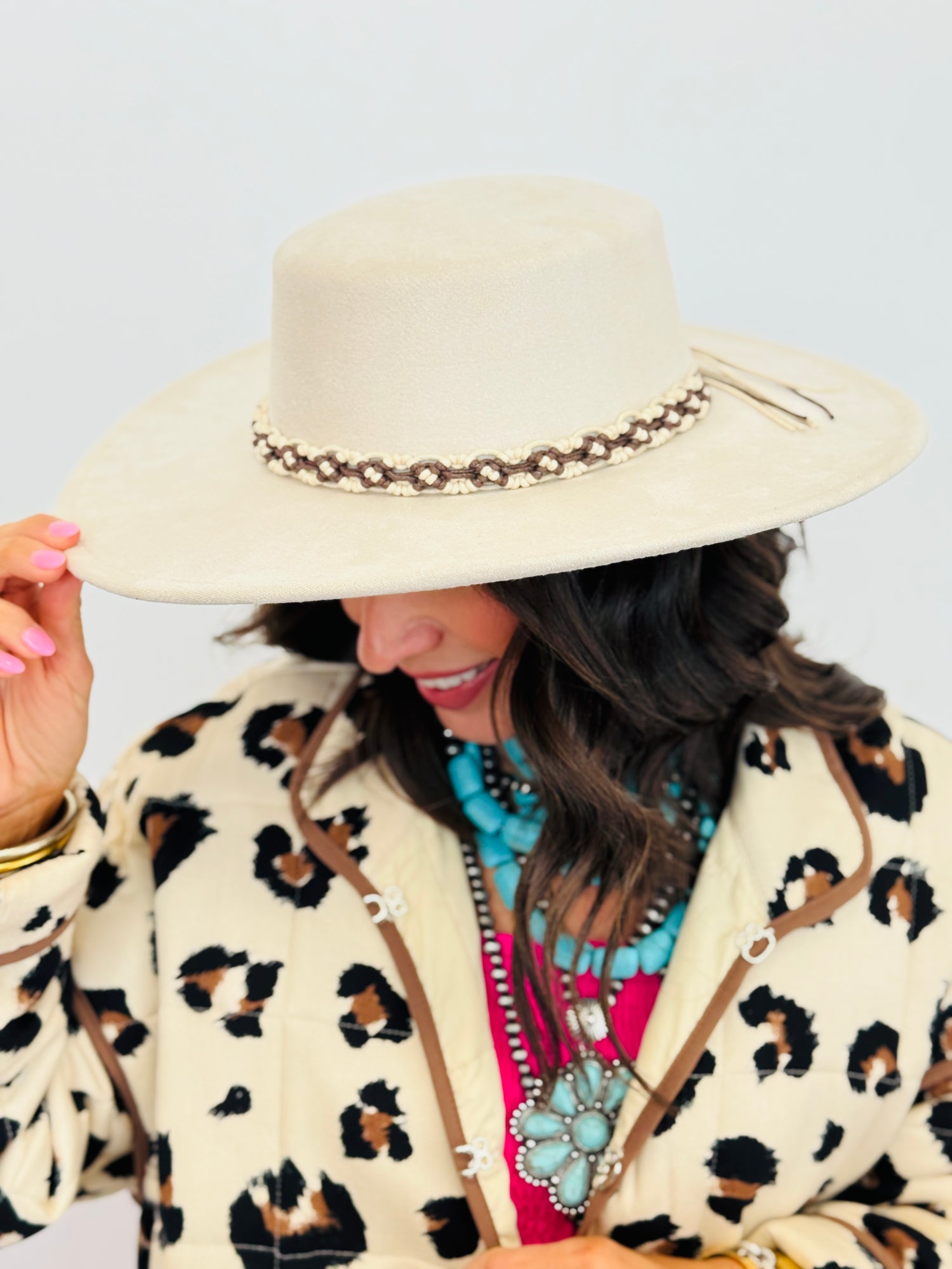 Step up your hat game with this charming boater that's equal parts sophisticated and fun. Crafted from buttery soft faux suede, it features a flattering wide brim perfect for sun protection and style. The standout macrame braided band brings artisanal flair and texture that elevates any outfit—from casual weekend vibes to dressed-up occasions. Available in three gorgeous colorways, this versatile piece is your new go-to accessory for making a statement.
