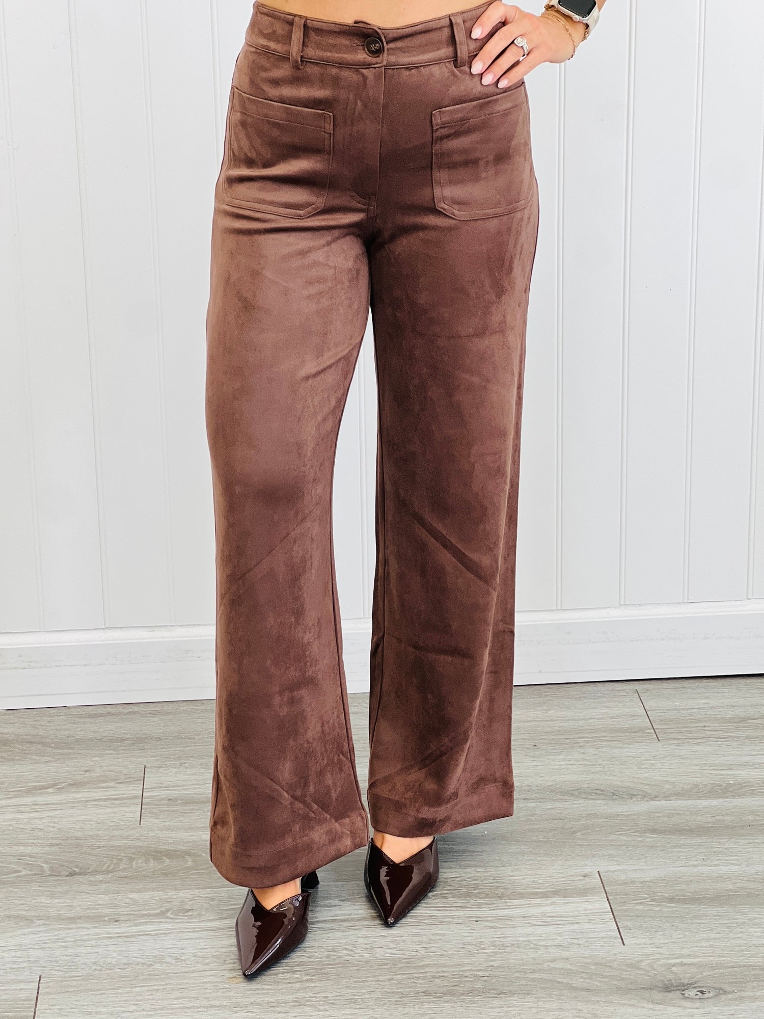 Add an element of chic sophistication to your wardrobe with our Faux Suede Wide Leg Pants. Features include a front button & zipper closure, front and back pockets and wide legs. These pants will elevate any outfit and keep you looking smart all day long.