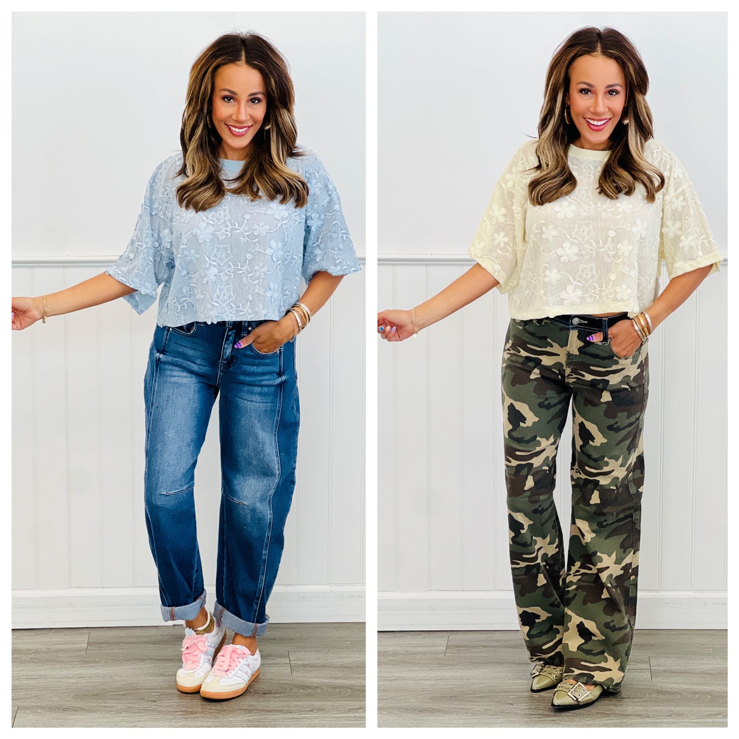 Elevate your collection with this charming floral embroidered mesh top. Featuring a delicate textured overlay, round neckline, short sleeves and relaxed silhouette, it layers beautifully over sheer tees or pairs effortlessly with high-waist trousers. A refined, versatile piece perfect for modern boutique styling and year-round appeal. Contemporary waist length boxy silhouette.