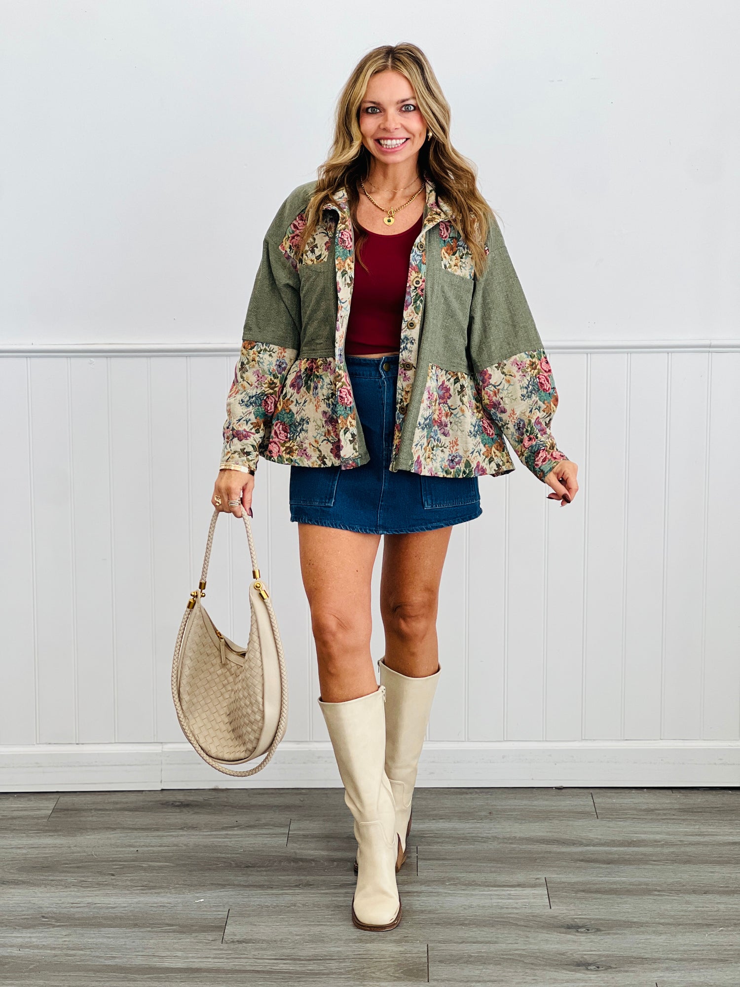 Bring a fresh element to your closet with this standout layering piece, This floral patchwork button down shirt blends soft vintage-inspired blooms with solid contrast panels for a modern twist. Designed with a relaxed fit, button-down front, collared neckline and subtle peplum hem, it brings refined charm to casual wear.