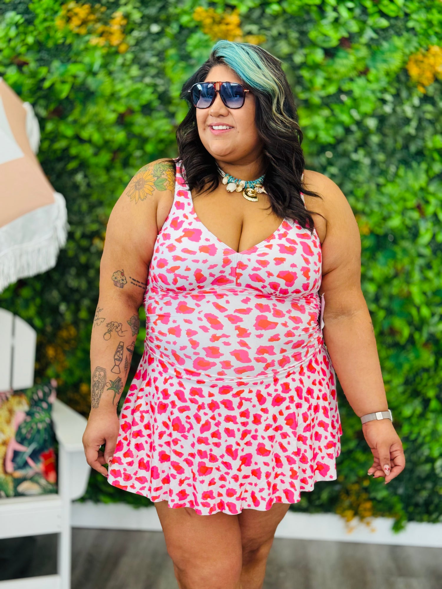 Get ready to make a splash in our White/Pink Leopard Swimsuit Mini Dress! With adjustable shoulder straps and a v-neckline, this dress flatters your figure while the bra pads provide support. The inner shorts come with a pocket for convenience, and the ruched waist adds a touch of style. Perfect for a day at the beach or pool!