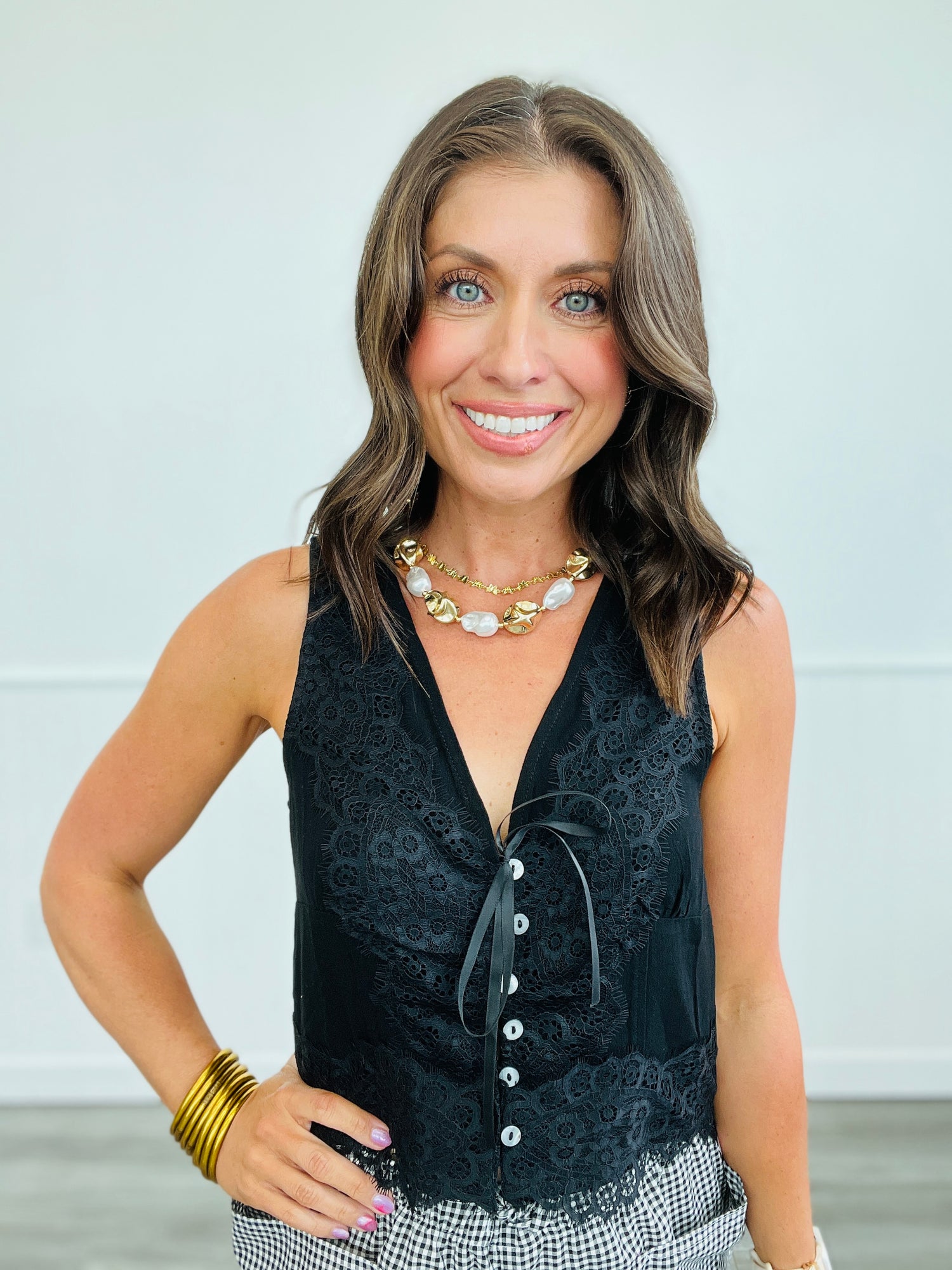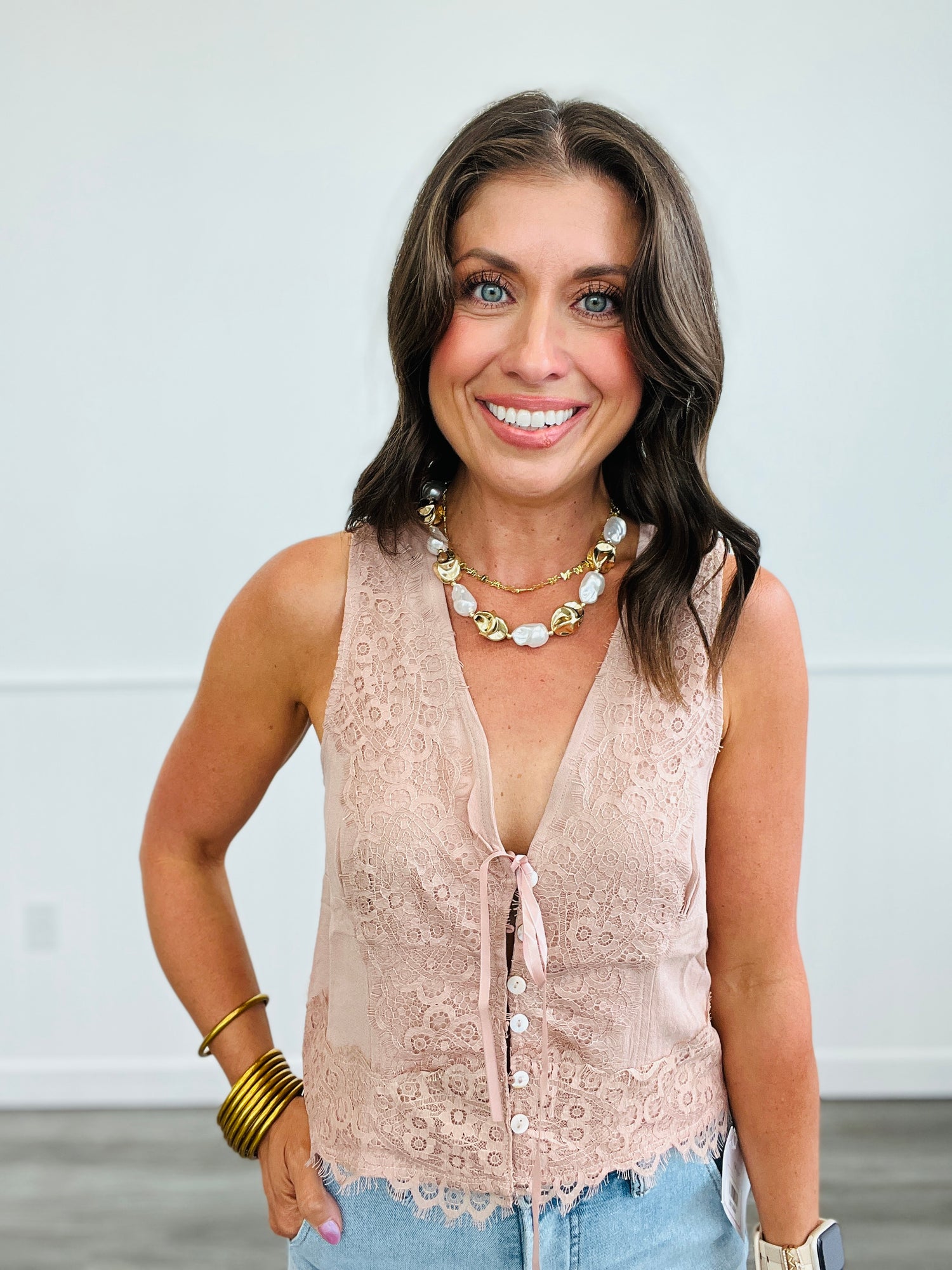 Get ready to turn heads in this playful and flirty lace tank! With a flattering v-neckline and a button down front, this sleeveless top is both stylish and comfortable. Perfect for a day out with friends or a fun date night, this tank is a must-have in your wardrobe.