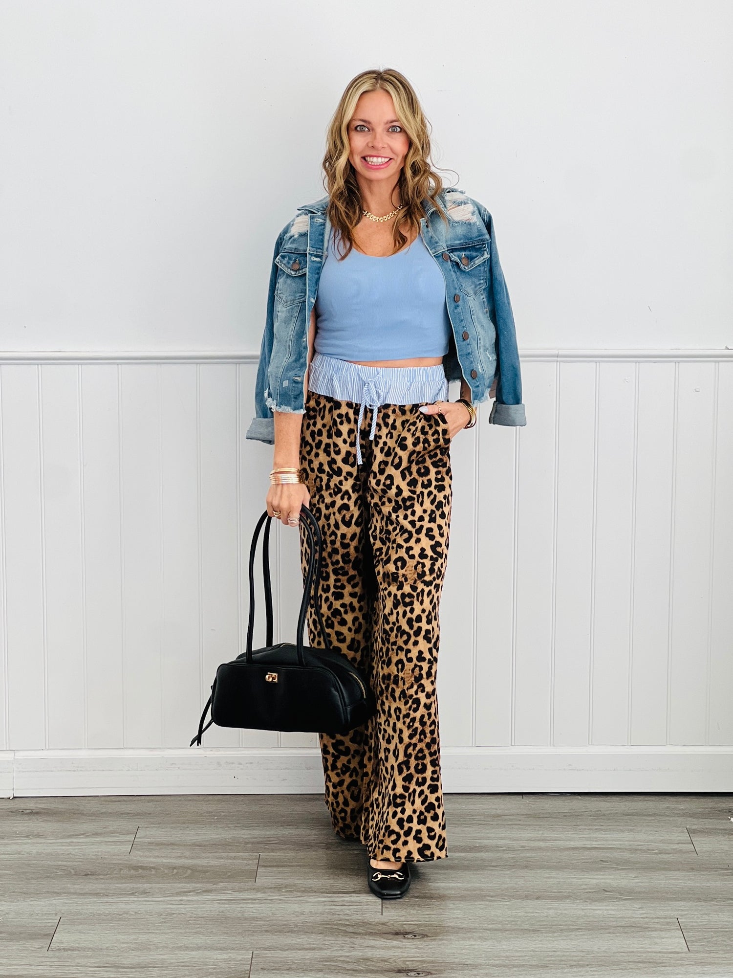 Make a statement in this playful leopard and stripe lounge set that's equal parts cozy and chic. The short sleeve button-down shirt features a bold leopard print paired with a crisp contrast stripe collar for unexpected flair. Slip into the matching wide-leg pants for an effortlessly put-together look that works from your couch to casual outings. Perfect for anyone who refuses to sacrifice style for comfort.