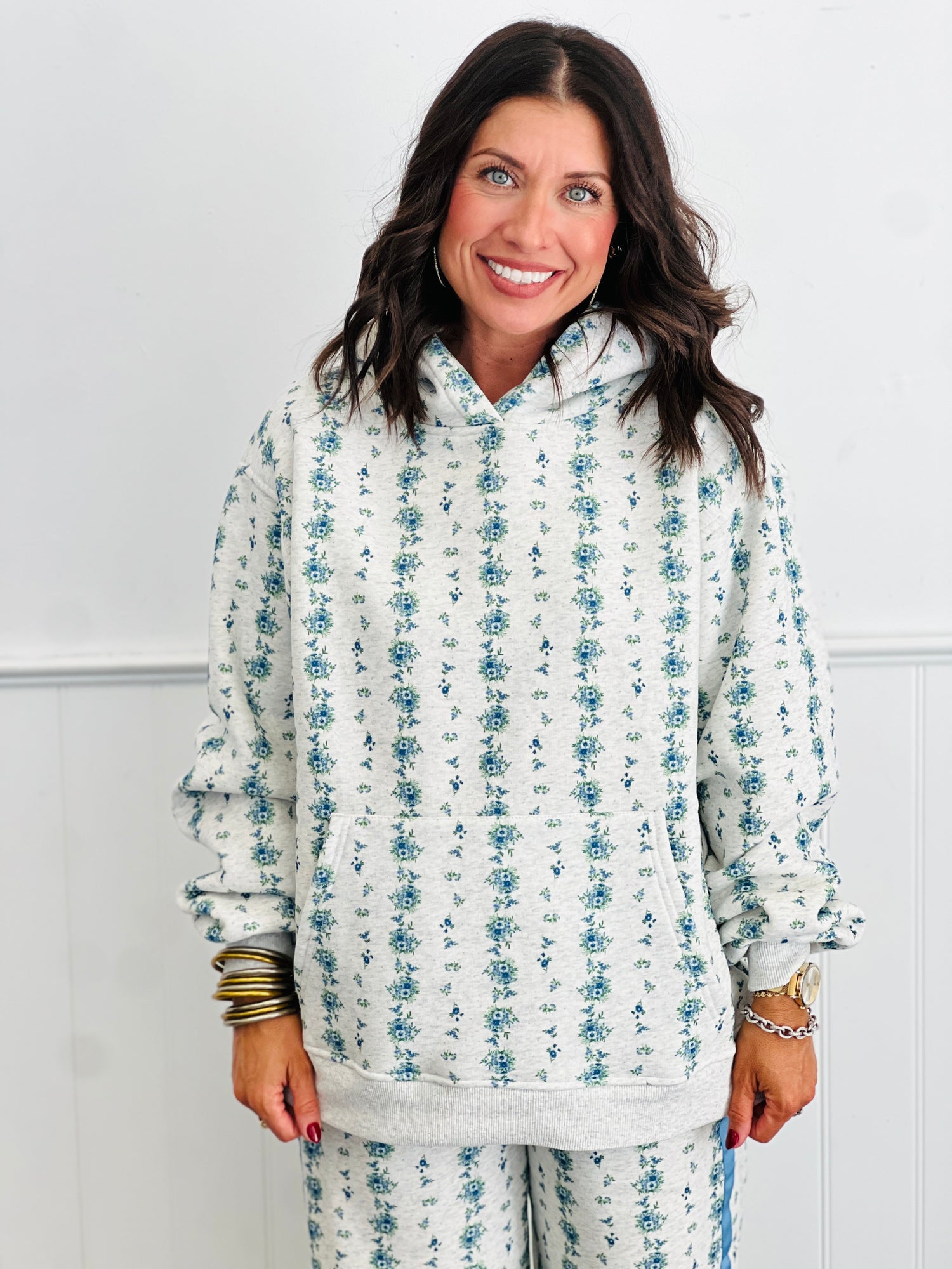 Introducing the precious H Grey/Blue Heavy Fleece Hoodie Sweatshirt. This cute and comfy top features a light heather grey background with a blue floral print, attached hoodie, long sleeves with contrast banded cuffs, side slant pockets, banded hemline and a cozy heavy fleece terry fabric. Perfect match to pants BOT6345.