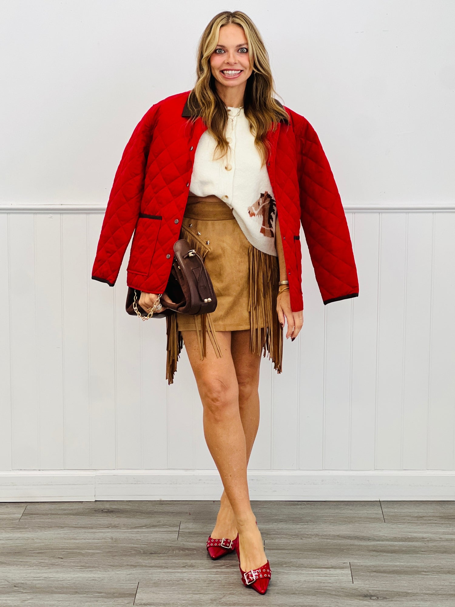 Add a touch of whimsy to your wardrobe with this Ivory Horse Sleeveless Cardigan. Featuring charming horse details along the bottom, this button-up design blends playful style with comfortable layering. Perfect for sunny days or cool evenings, it’s a fun way to show off your love for horses while keeping your look effortlessly chic.