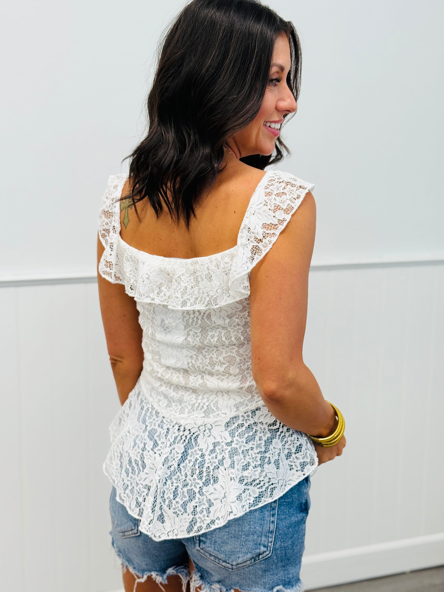 Add a touch of femininity to your wardrobe with our ruffled floral lace top. The square neckline and flutter sleeves add a playful touch, while the curved hemline provides a flattering silhouette. Perfect for any occasion, this top is a must-have for the stylish and fun-loving woman!