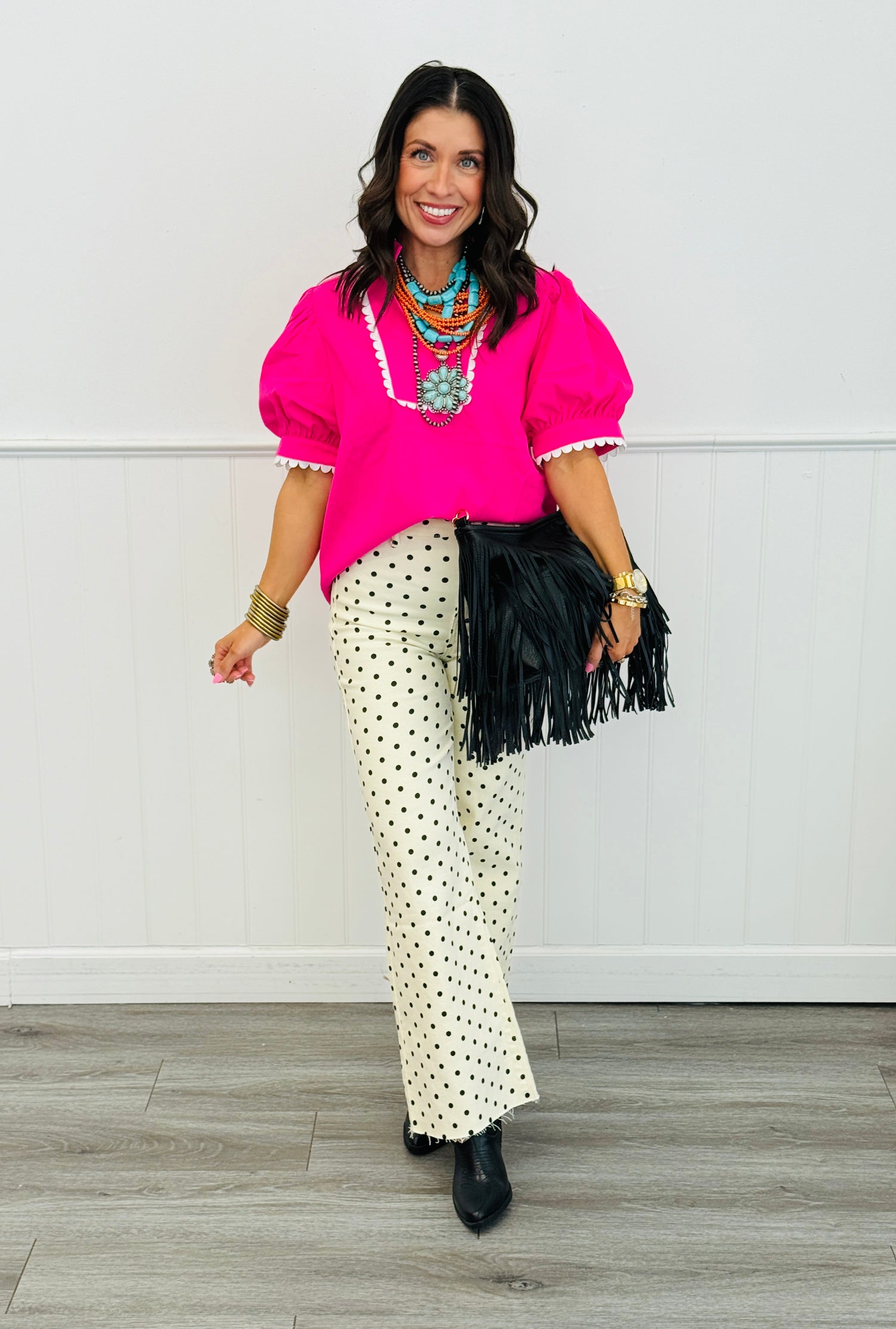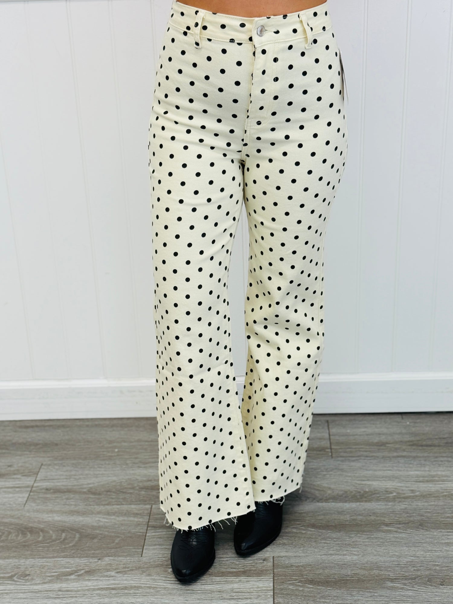 Elevate your everyday style with these ivory denim pants featuring an adorable mini polka dot pattern that brings instant charm to any outfit. Crafted from stretchy denim, they move with you throughout the day while maintaining a flattering silhouette that works equally well for casual hangouts or dressed-up occasions. The playful polka dots add personality without compromising versatility, making these pants a fun staple you'll reach for again and again.