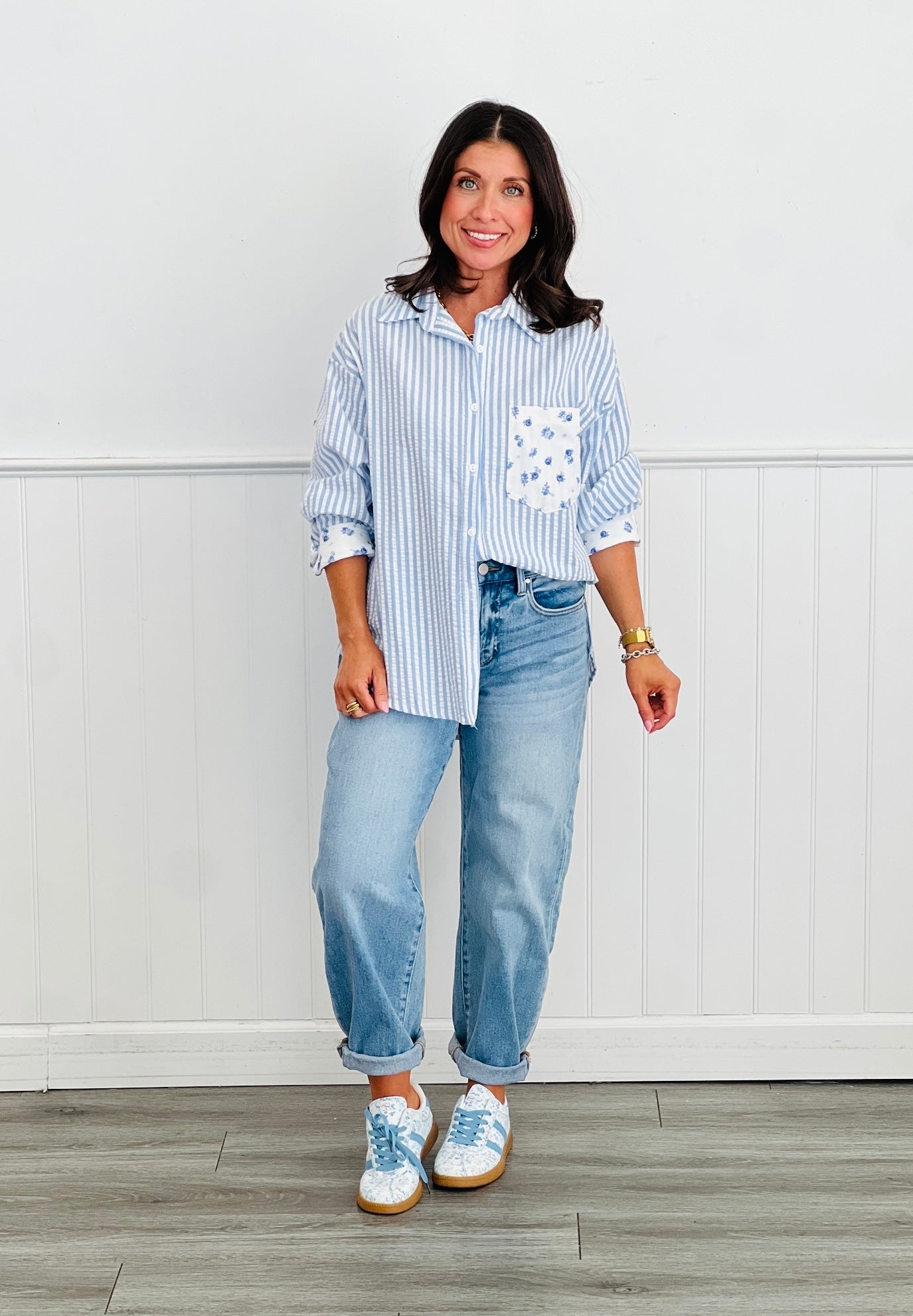 Introducing the relaxed fit Ivory Multi Floral Contrast Shirt. Features include both stripes and floral prints fabrication, button-down front, long sleeves and collar.