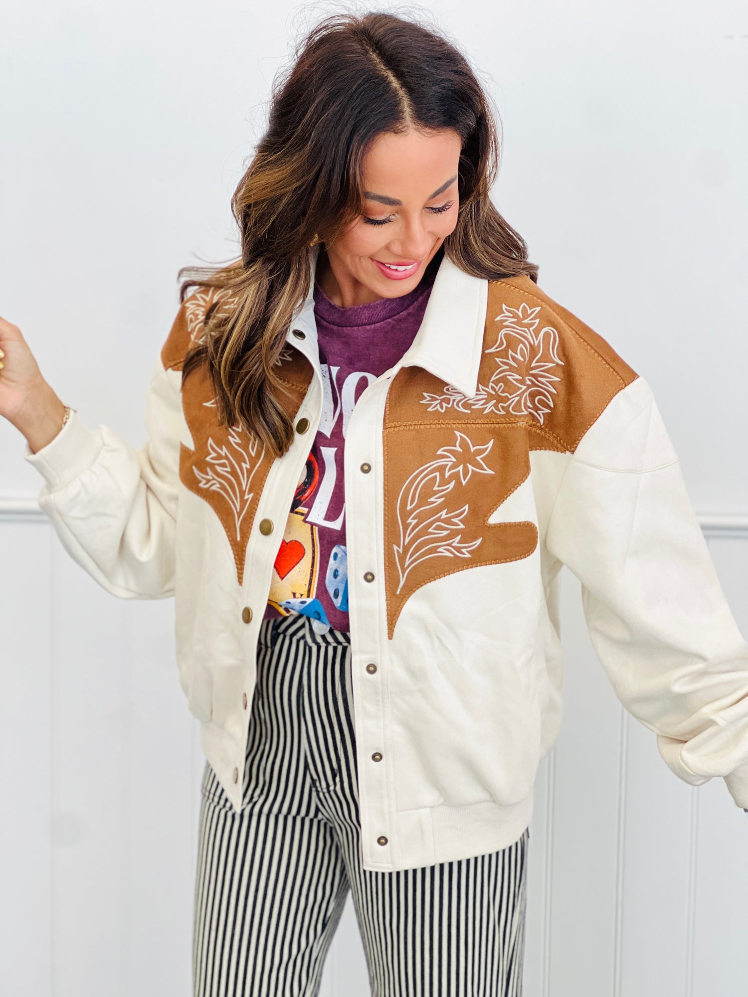 Step into a style adventure with the Ivory Multi Western Snap Button Up Jacket! Featuring charming embroidered western details and easy snap closures, this pocket jacket blends playful flair with casual comfort. Perfect for adding a touch of cowboy cool to your everyday look.