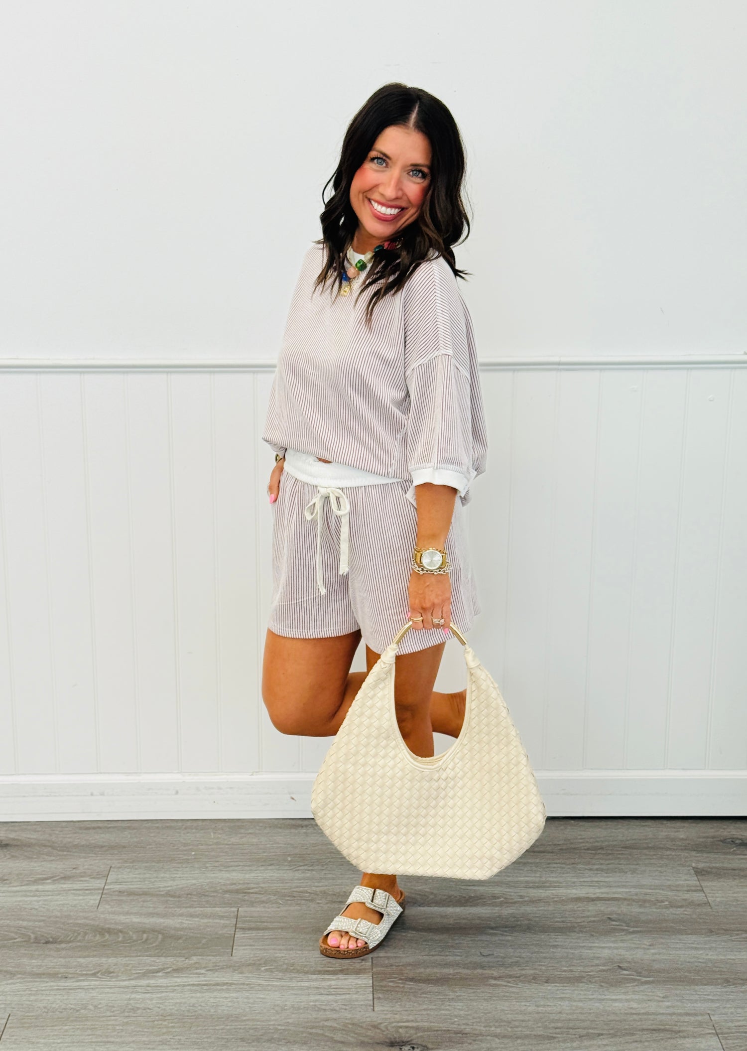 Refresh your everyday core shorts collection with the colorful Ivory/Red Striped Shorts. Features include an elastic waist with drawstring, pockets and relaxed regular fit silhouette. Match to tee TOP12258.