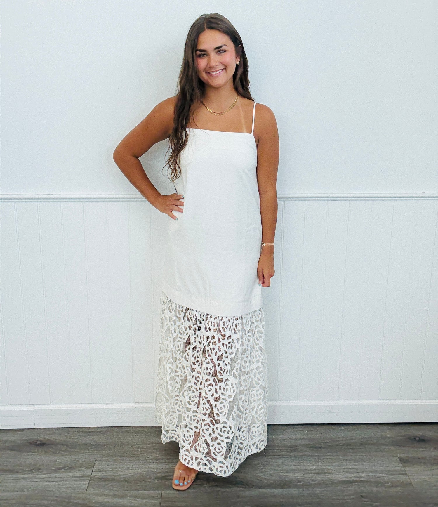 Elegant and classy Ivory Rosette Lace Midi Cocktail Dress is the perfect blend of romance and sophistication. Featuring a flattering square neckline and delicate thin spaghetti straps, this dress offers a timeless, minimalist silhouette. The loose body provides a relaxed yet elegant fit, while the sheer rosette floral lace bottom adds a touch of romance and texture. Ideal for bridal season or a chic cocktail event, this dress exudes understated elegance, making it a perfect choice for those seeking a graceful, romantic look. Effortlessly stylish and versatile, it's a stunning addition to any occasion.