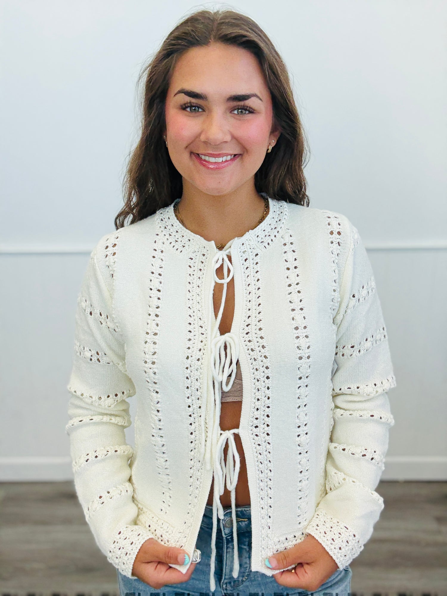 Delightfully feminine and cozy Ivory Triple Bow Tie Sweater Cardigan features a round neck, triple front bow tie closure and full long sleeves. Openwork crochet throughout.