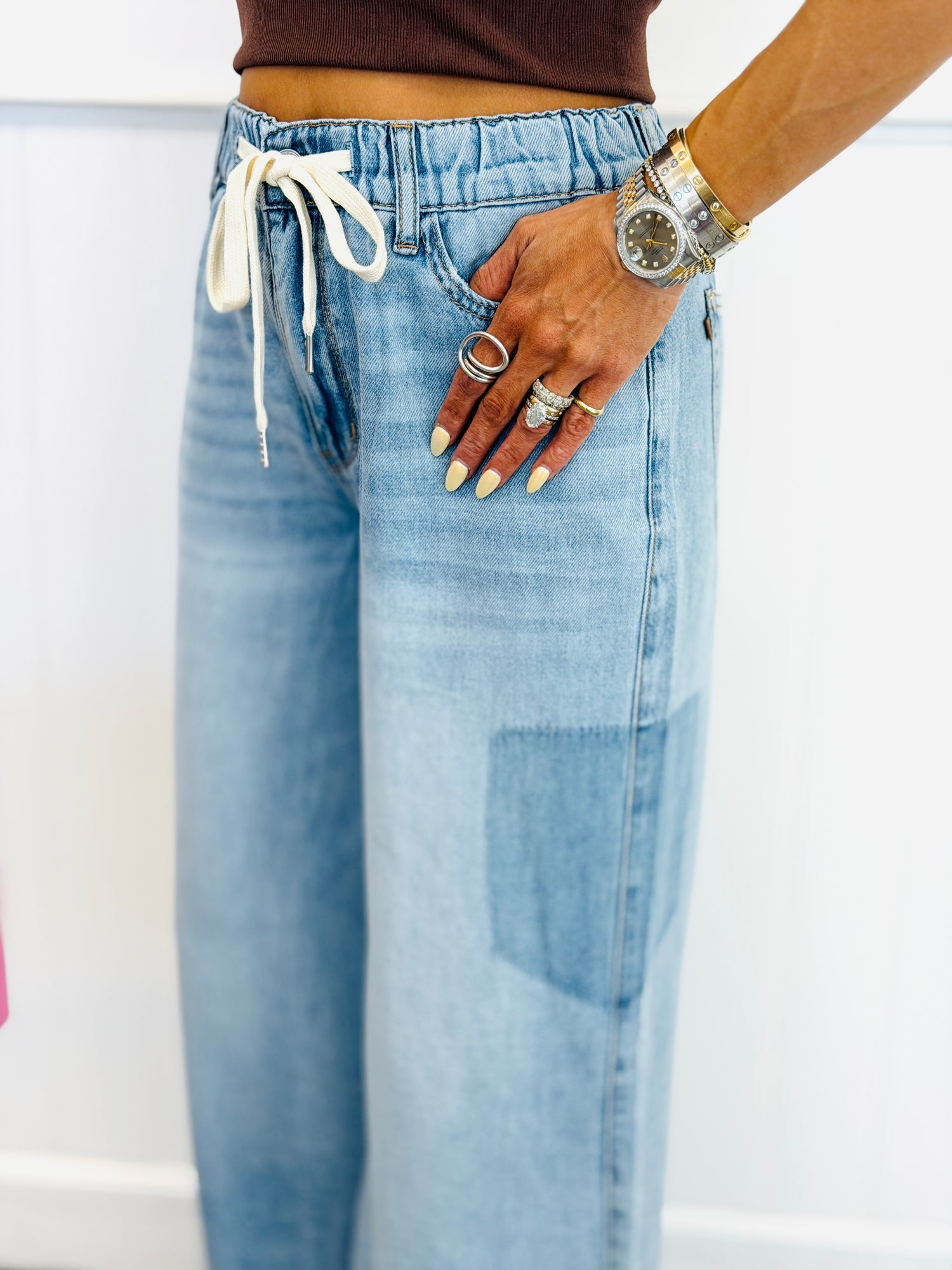 Say hello to your new go-everywhere favorite. These Judy Blue palazzo jeans are featherlight and impossibly comfy, featuring a flattering high waist that actually stays put thanks to the elastic waistband and adjustable drawstring. The shadow light wash gives them that cool, understated vibe, while the wide-leg silhouette skims beautifully over any shoe. And yes—functional pockets that actually work. Throw them on for lazy Sundays, weekend getaways, or dress them up with a fitted top for instant sophistication. Effortless style that doesn't require a second thought.