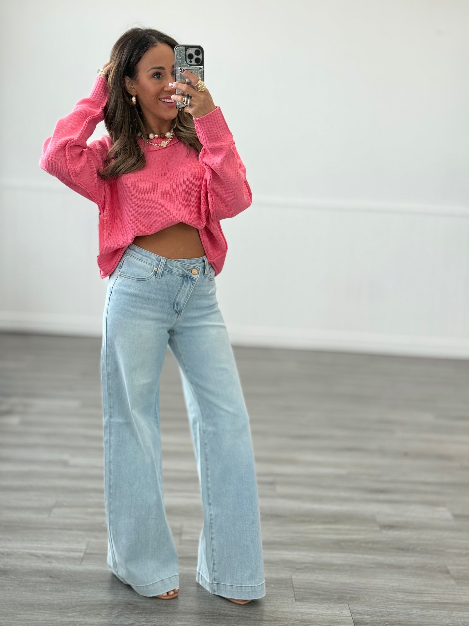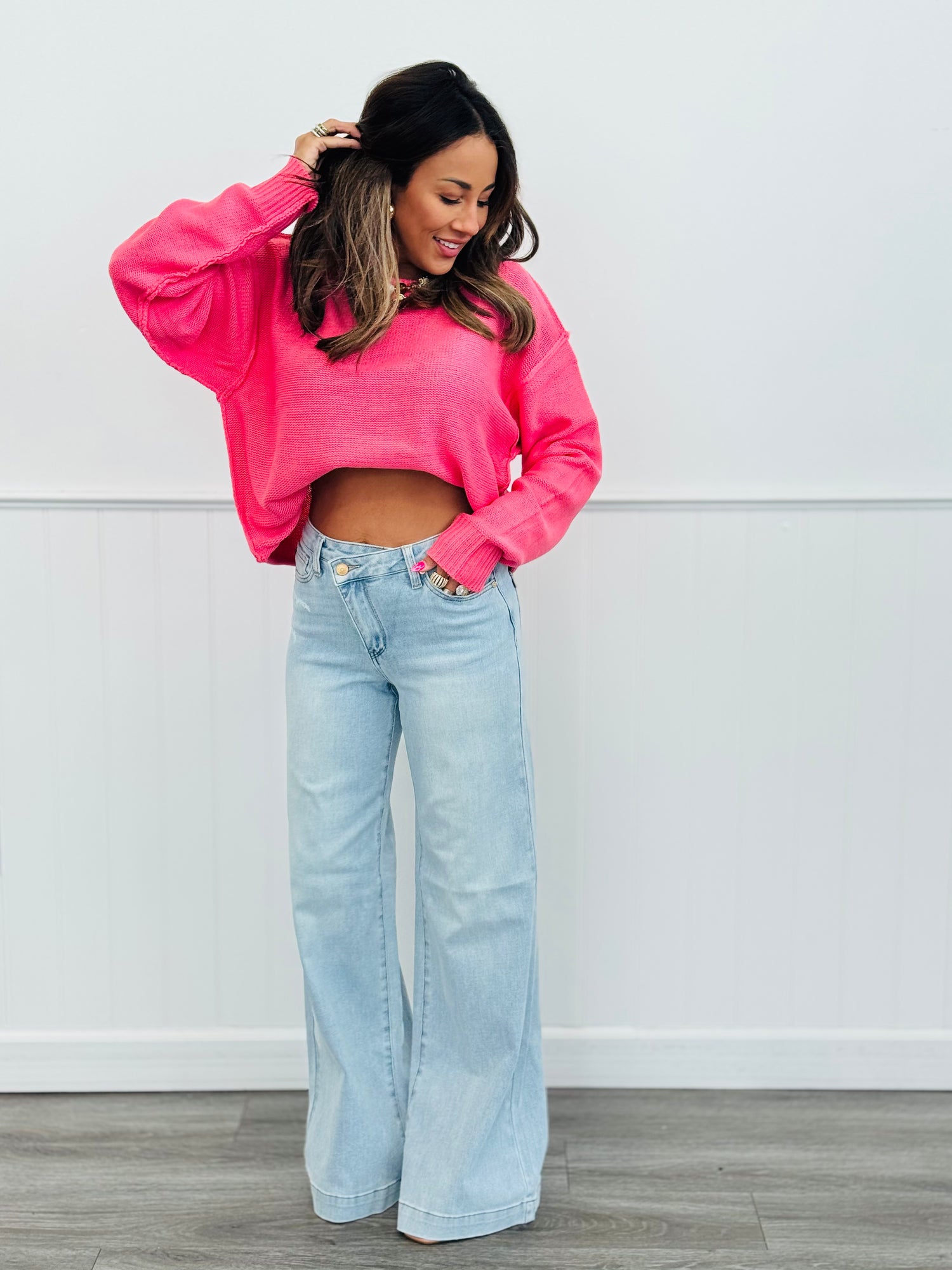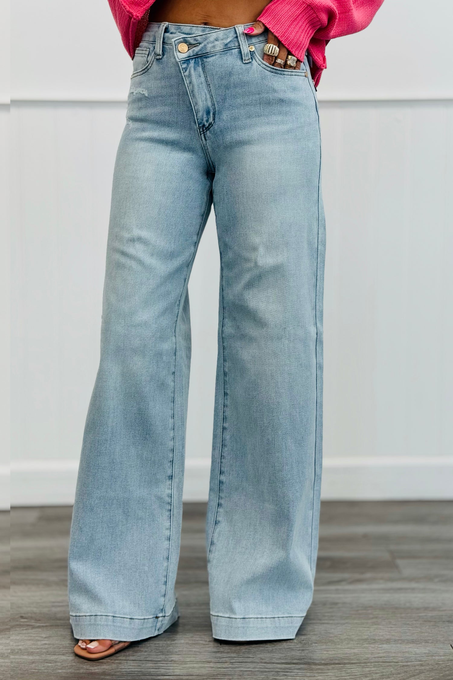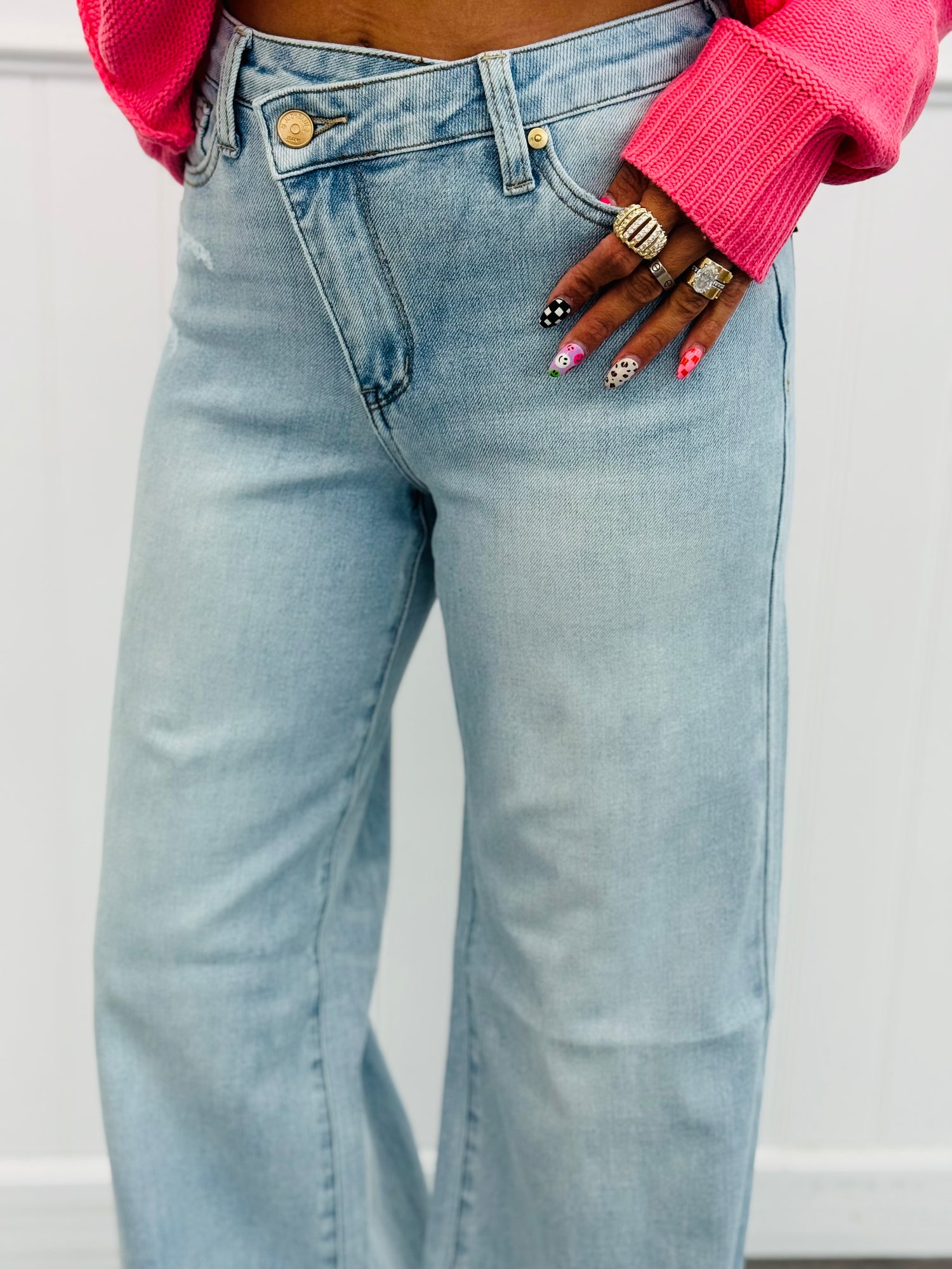 Embrace a playful retro look with the Judy Blue Star-Crossed Wide Leg Jeans! These high-waisted jeans feature a unique criss-cross waistband and subtle distressing for a touch of vintage charm. Designed with a wide leg silhouette, they offer both comfort and style, perfect for making a fun statement wherever you go. Available in regular and plus sizes to fit your vibe just right!
