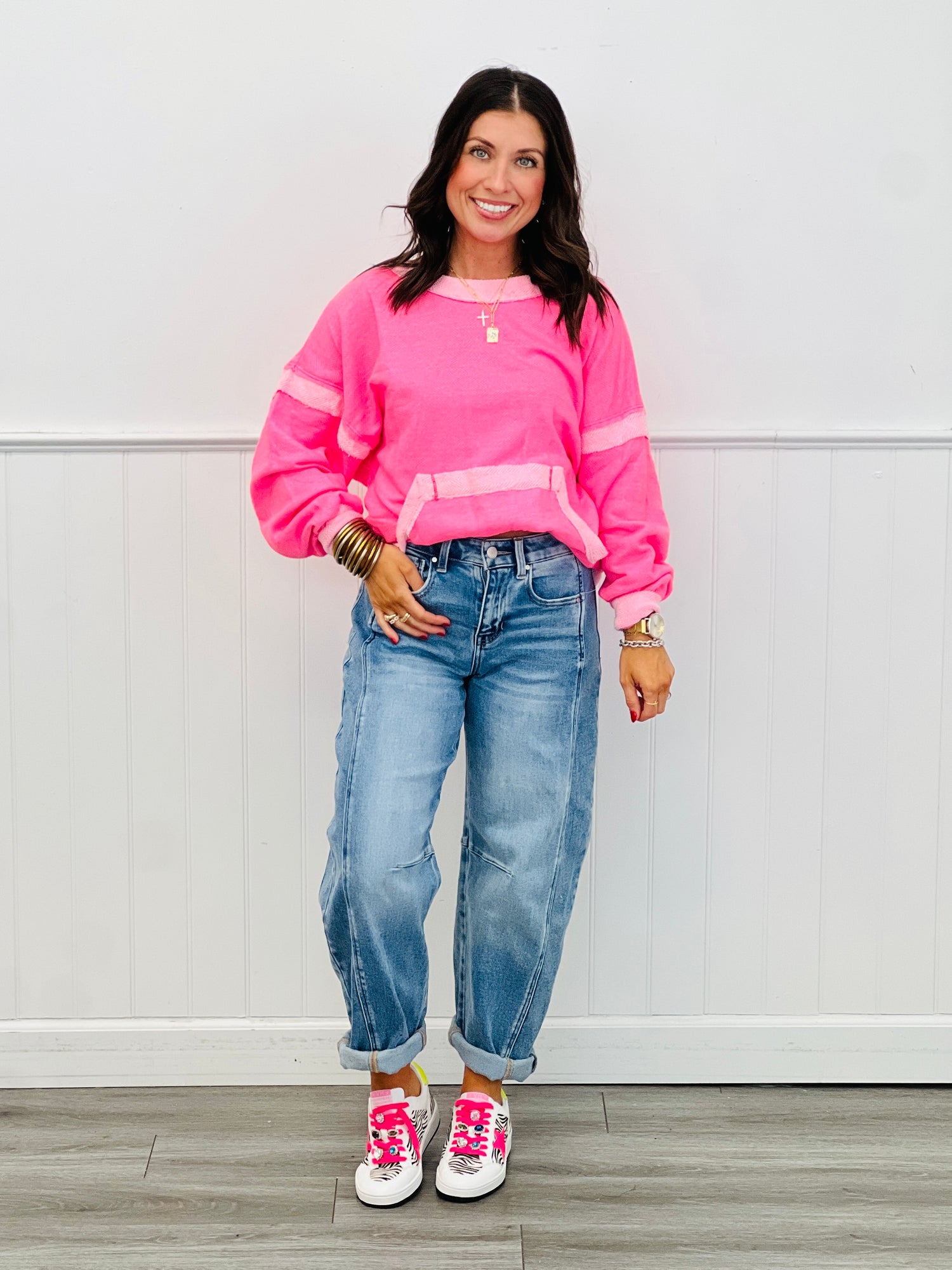 Stay cozy and stylish this season wearing the super cute Kangaroo Pocket Sweatshirt! This effortless pullover top features a boat neckline, long sleeves, a kangaroo pocket, raw edge detail and relaxed fit.