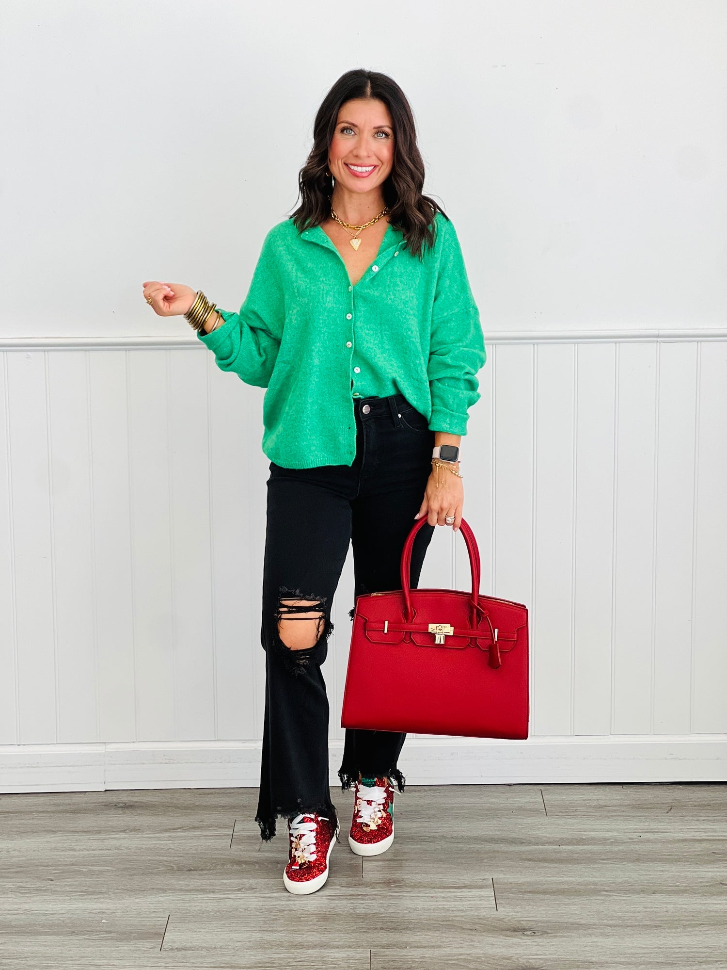 Stay cozy and stylish with our Kelly Green Gigi Cardigan. This versatile cardigan features a loose fit for added comfort. The long sleeve design ensures both warmth and fashion in one. Perfect for any occasion, you'll be the talk of the town in this quirky and playful piece.