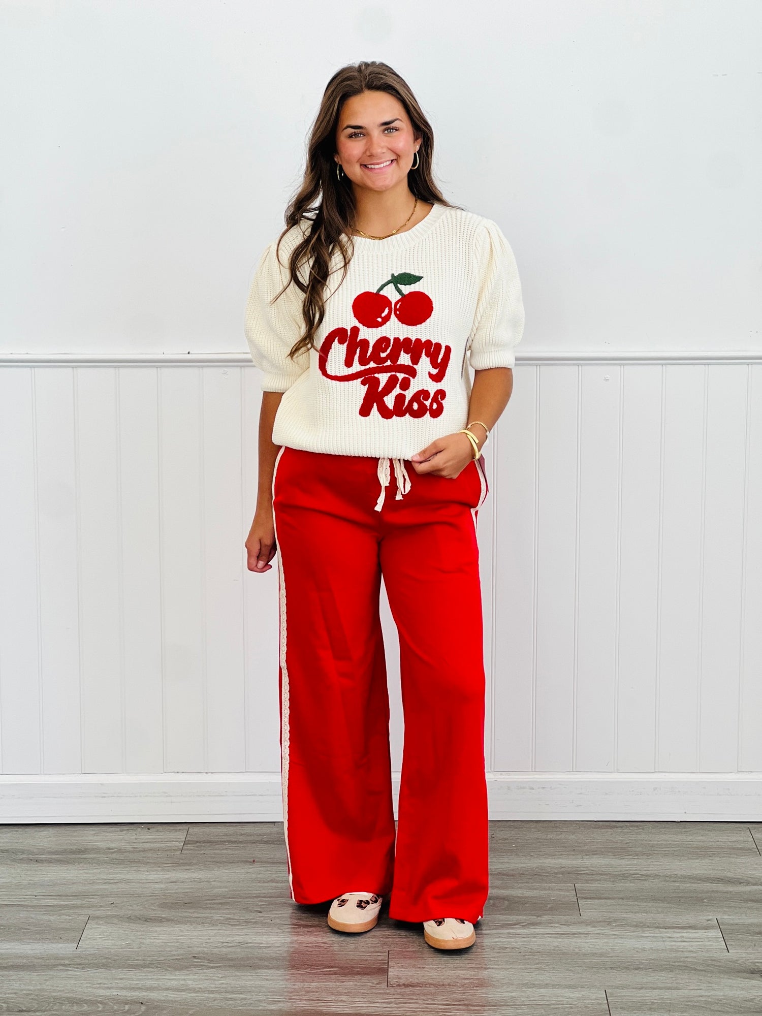 Introducing our Lace Side Stripe Terry Sweatpants! These super cute and comfy pants feature an elastic waist, lace drawstring belt, wide legs and lace side stripes.
