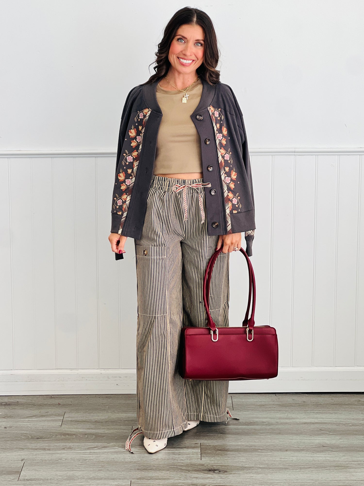 These stylish latte vintage washed stripe pants feature an elastic waist for comfort, cargo pockets for convenience, and a drawstring for adjustable fit. Perfect for those who want to look and feel good without sacrificing functionality.