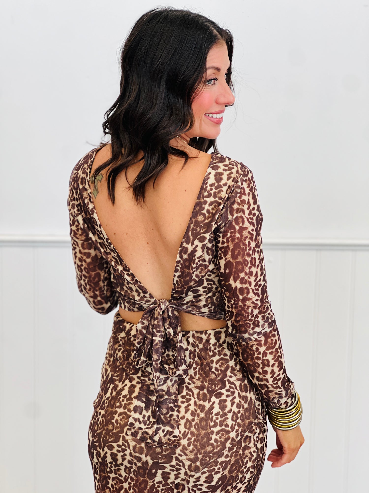 Introducing a stunning ensemble perfect for any wardrobe: the leopard print maxi skirt paired exquisitely with a flattering long sleeved slightly cropped top with a deep-v back. This set features a silhouette that skims gracefully along your curves, culminating in a gently flared hem for a touch of elegance.
