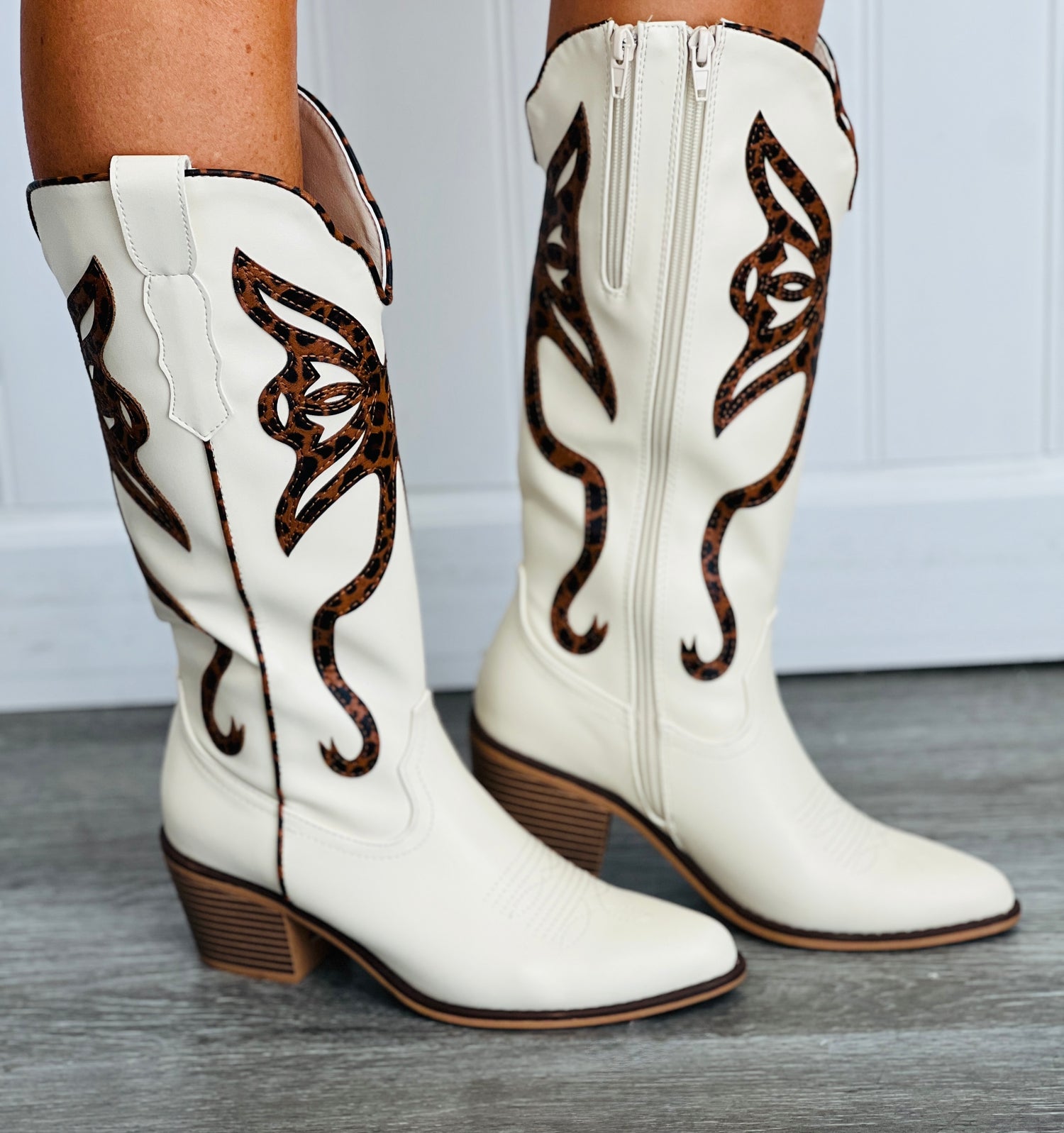 Step out in style with the Leopard Flutter On By Boots, featuring a white shade adorned with a delicate leopard butterfly design. The pointed toe adds a sleek edge while the sturdy block heel offers comfortable height for all-day wear. Perfect for adding a playful pop to any outfit, these boots are sure to turn heads wherever you go.