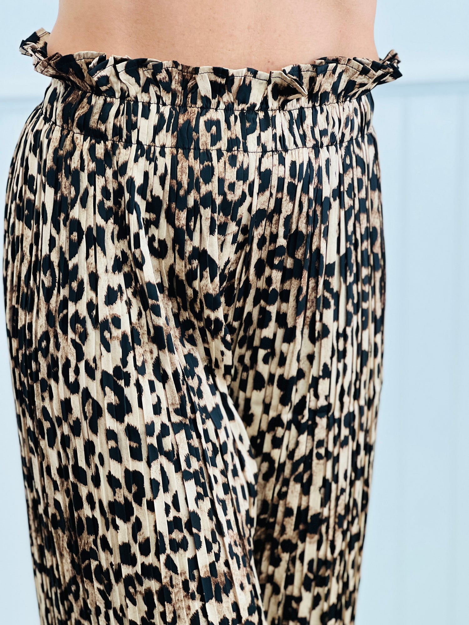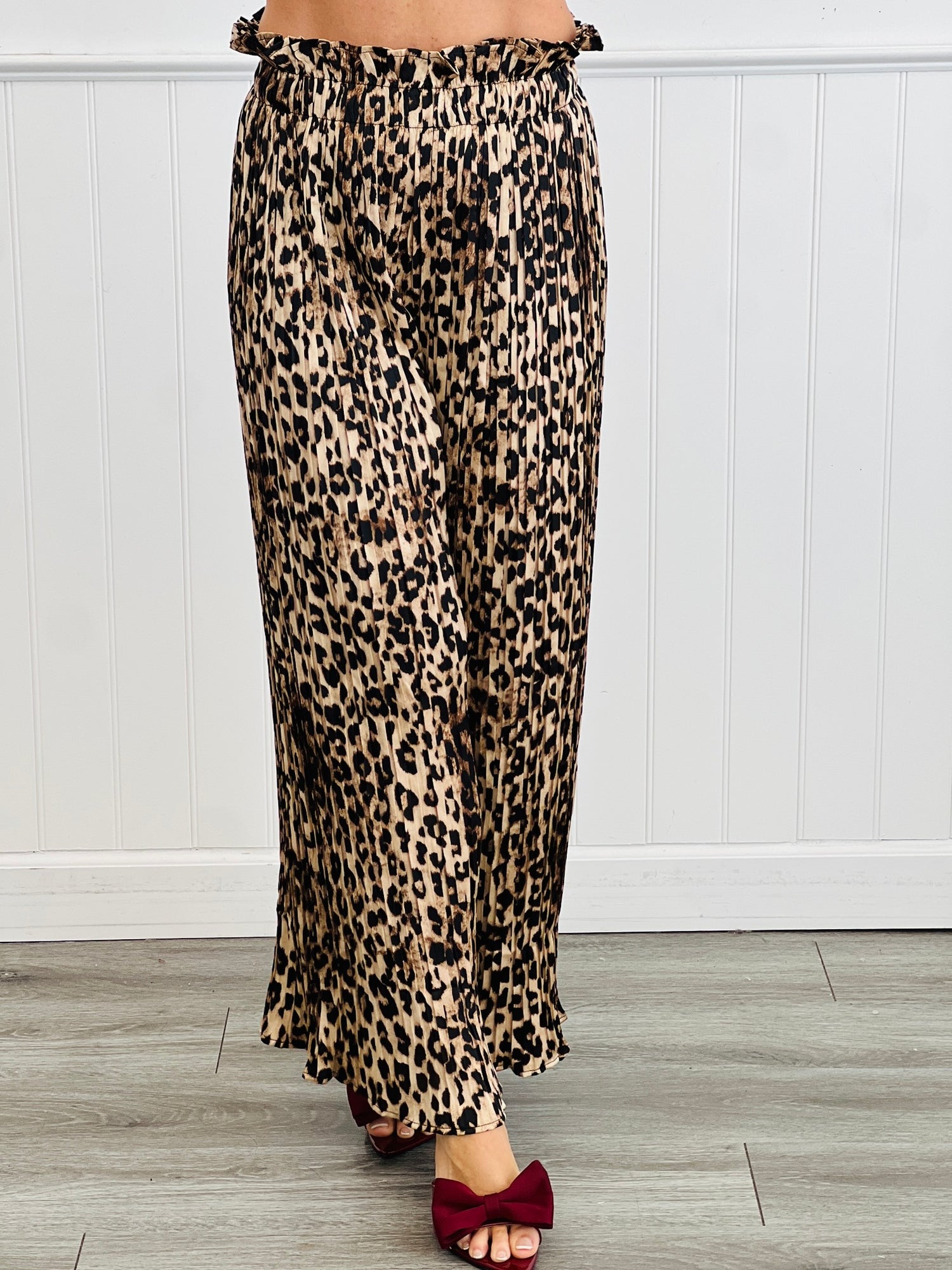 This bold two-piece set pairs a relaxed button-front shirt with wide-leg pleated pants in a striking brown leopard print. Features include a button-down long sleeved shirt with side slit and high-low silhouette paired with matching pants. Designed for effortless wear, the fluid silhouette offers comfort with a statement edge. Perfectly versatile separates styled together or apart, delivering standout looks for day-to-night dressing.