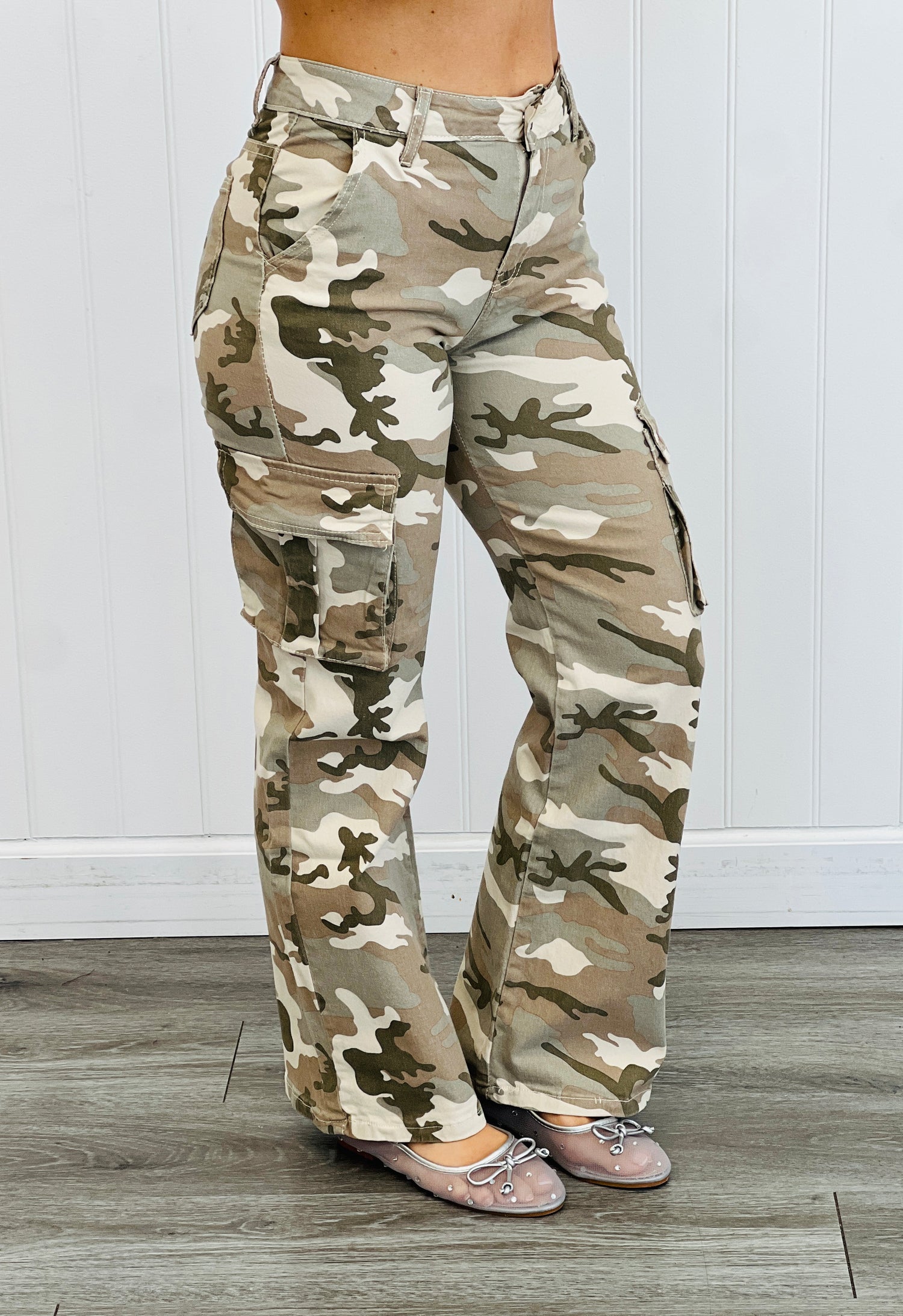 Step into comfort and style with these light camo pants designed to bring out your adventurous side. Featuring roomy cargo pockets for all your essentials, a flattering high-rise fit, and a trendy wide leg silhouette, they're perfect for those who love to mix function with fun. Whether you're exploring the city or relaxing with friends, these pants add a playful edge to any outfit.