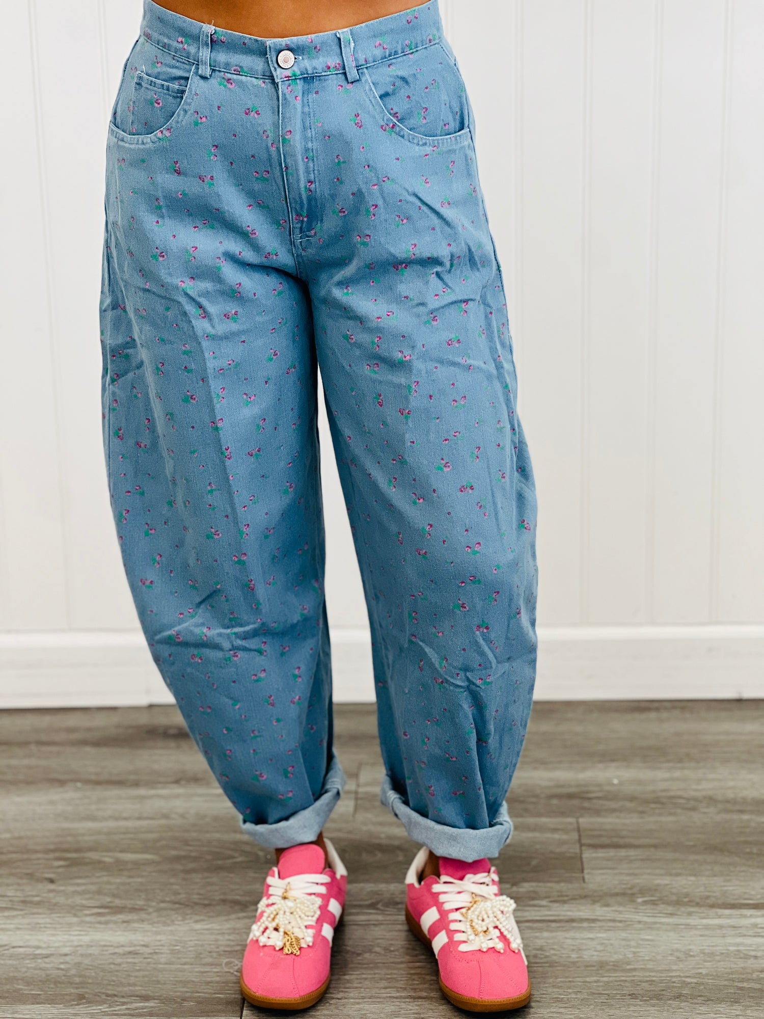 Show your personal style with the design-forward super cute Light Denim Print Barrel Pants! Features include a subtle print denim fabrication, front button & zipper fly closure and barrel leg silhouette. Match to peplum cami TOP11199.