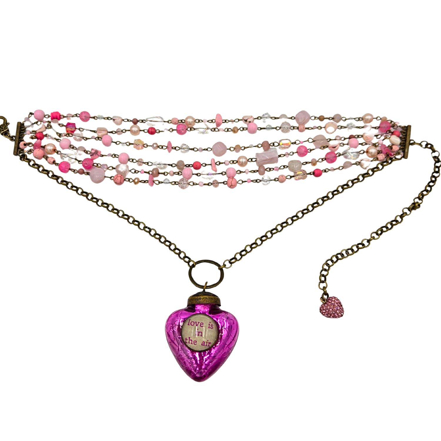 Wrap yourself in romance with this charming multi-strand choker that layers delicate antique gold and soft pink beads for an effortlessly chic look. The star of the show? A longer center chain featuring a stunning dark pink glass heart pendant engraved with "Love is in the Air"—a sweet reminder to celebrate love in all its forms. Perfect for date nights, galentine's gatherings, or whenever you want to add a touch of whimsy to your everyday style.