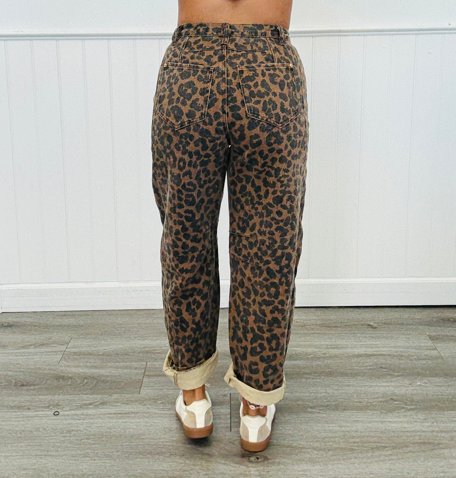 Super cute brown leopard print pattern ankle-length pants. Button fly-front and zipper closure plus pockets at sides and back patch pockets. Unlined. Woven. Non-sheer. Lightweight.