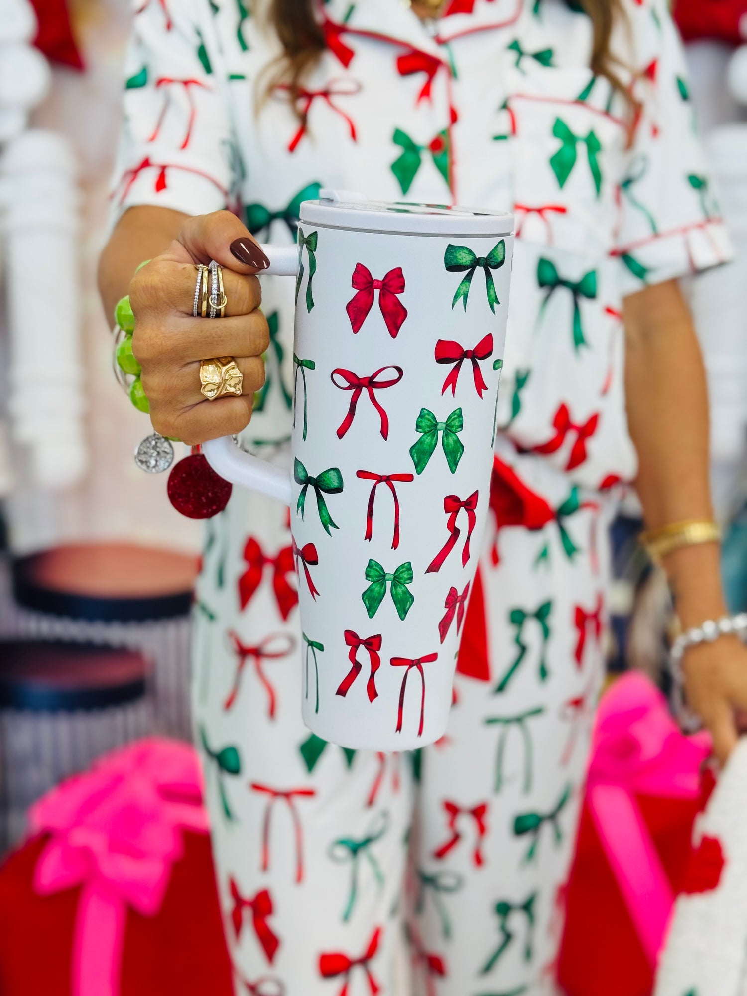 Enjoy your holiday drinks with the Santa's Signature Bow Tumbler! Featuring a nostalgic Santa design and pretty delicate bows, it keeps your beverages cool while adding a cheerful touch to your festive style.