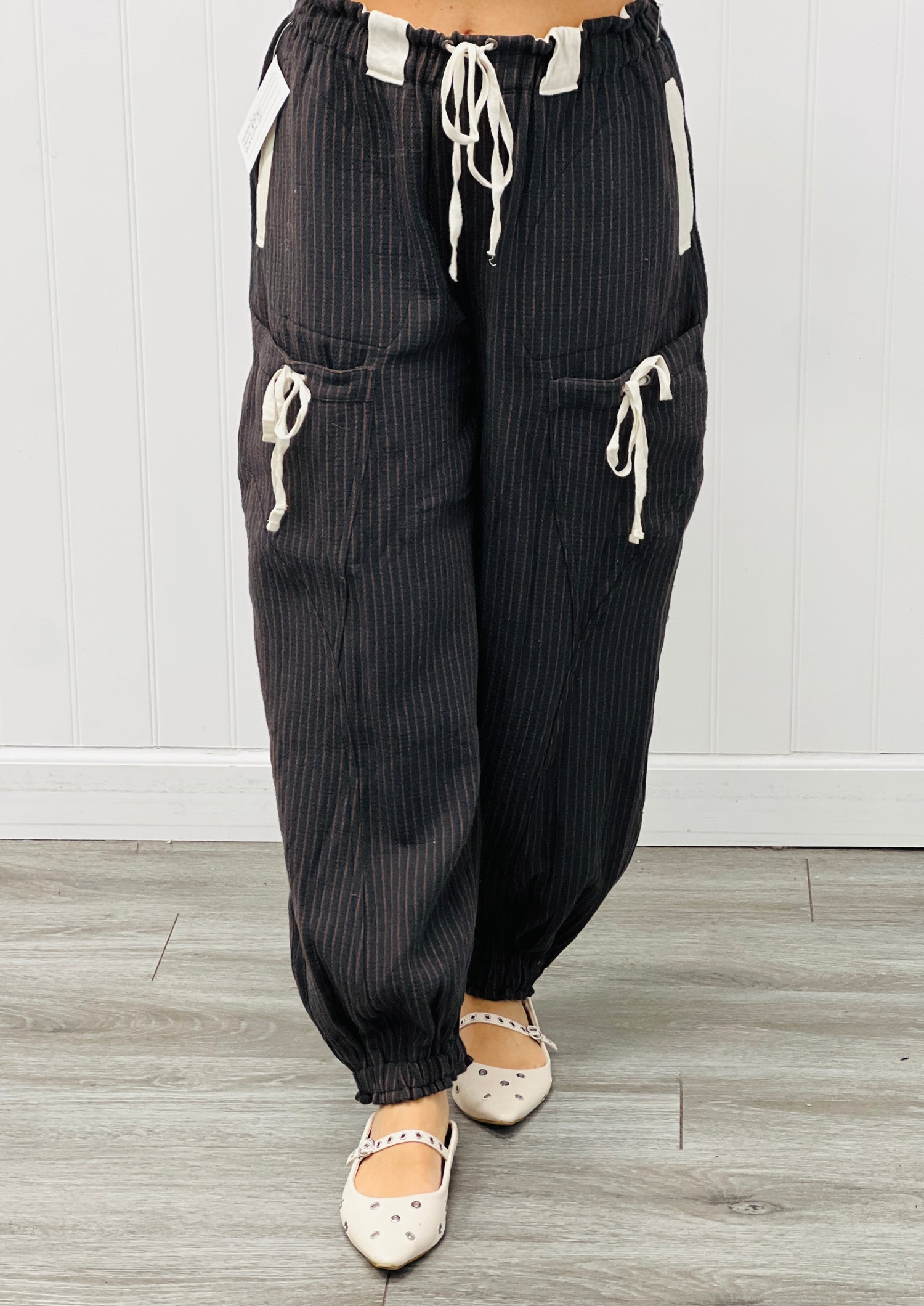 Slip into the Midnight Striped Barrel Joggers for a fun twist on casual comfort. Featuring a playful striped design and a handy drawstring waist, these joggers keep you cozy while letting you adjust the fit just right. With side front pockets, you have the perfect spot for your essentials on the go. Perfect for lounging or making a relaxed statement wherever you roam!