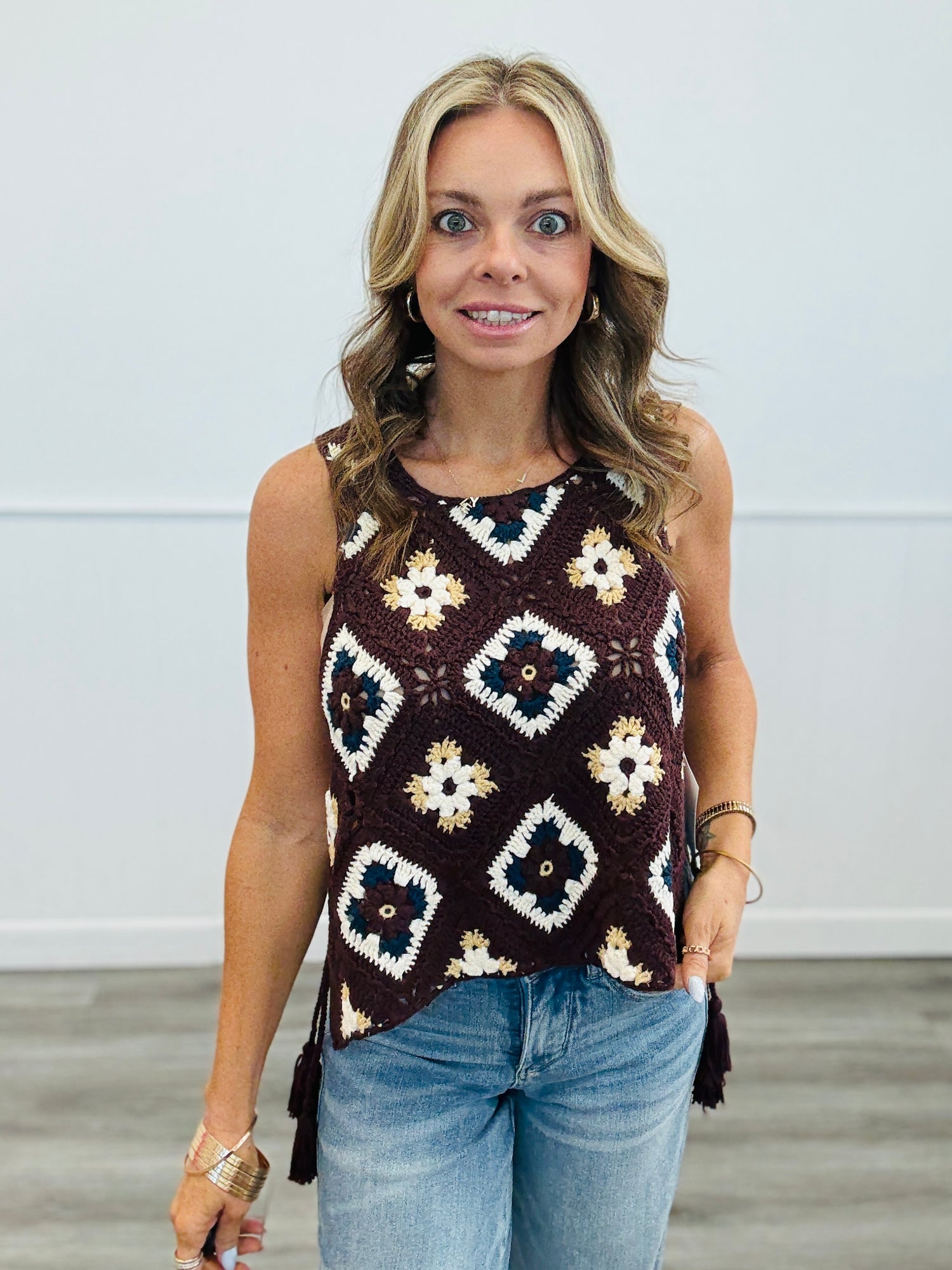 Mocha Crochet Granny Squares Side Tie Vest (Reg.)