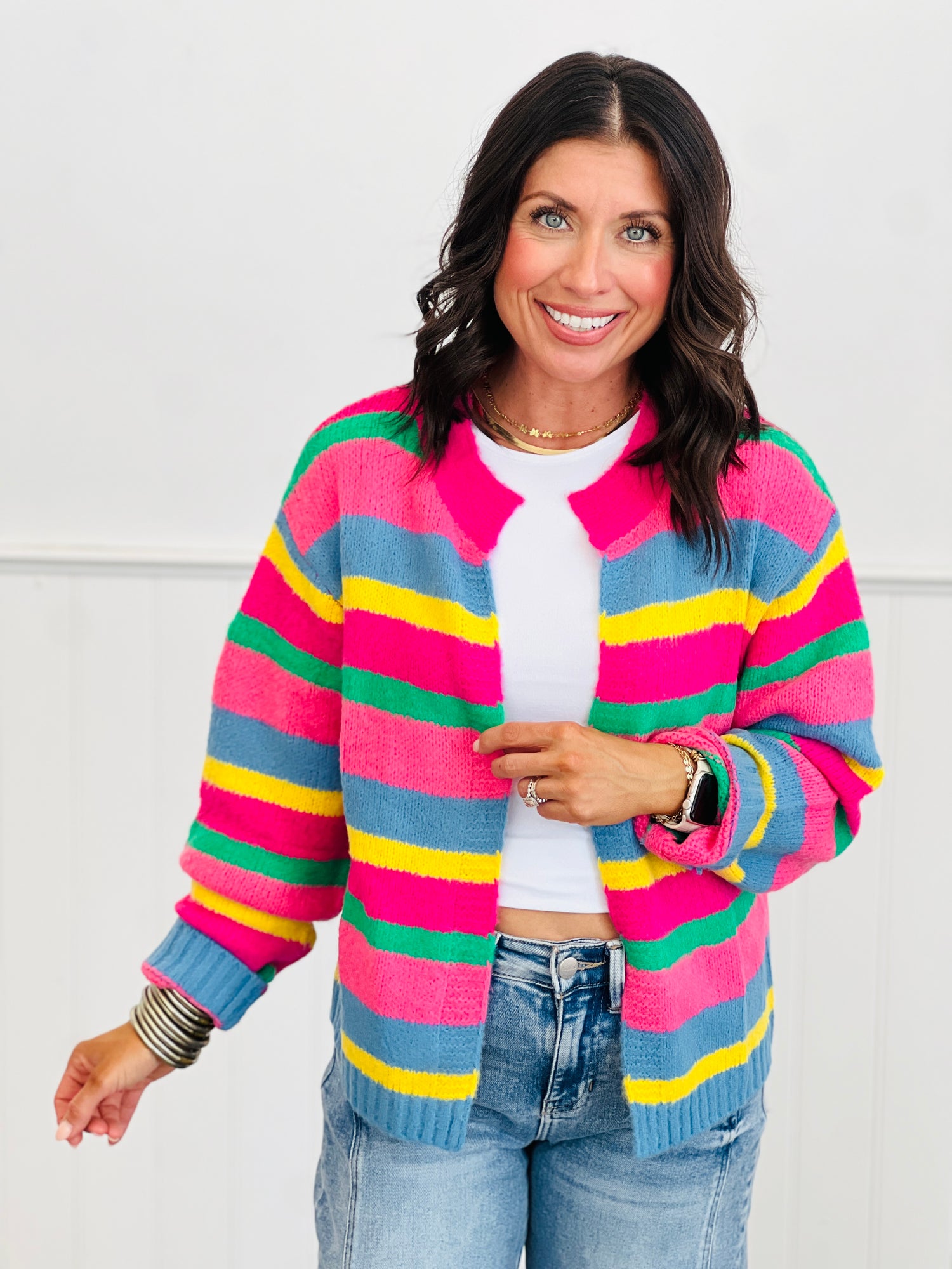Add a splash of fun to your wardrobe with this Multi Colored Striped Knit Cardigan! Cozy and vibrant, it wraps you in warmth while showcasing a lively mix of colors that brighten any outfit. Whether dressed up or down, this playful knit is the perfect companion for every day—and for every size, with both regular and plus options available.