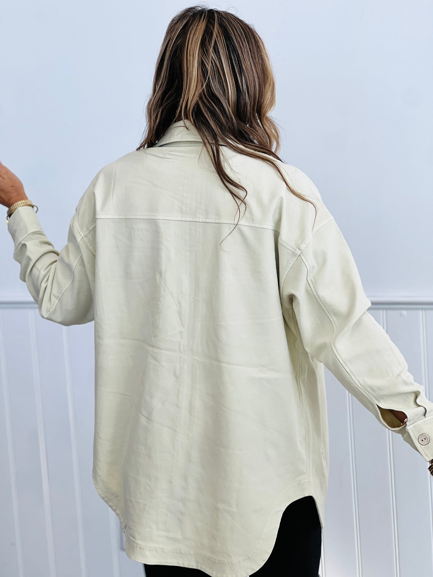 Combine the rugged appeal of workwear with modern fashion sensibilities! Our oversized twill shacket features a full front zip, oversized cargo pockets, tunic length and welt hand pockets.
