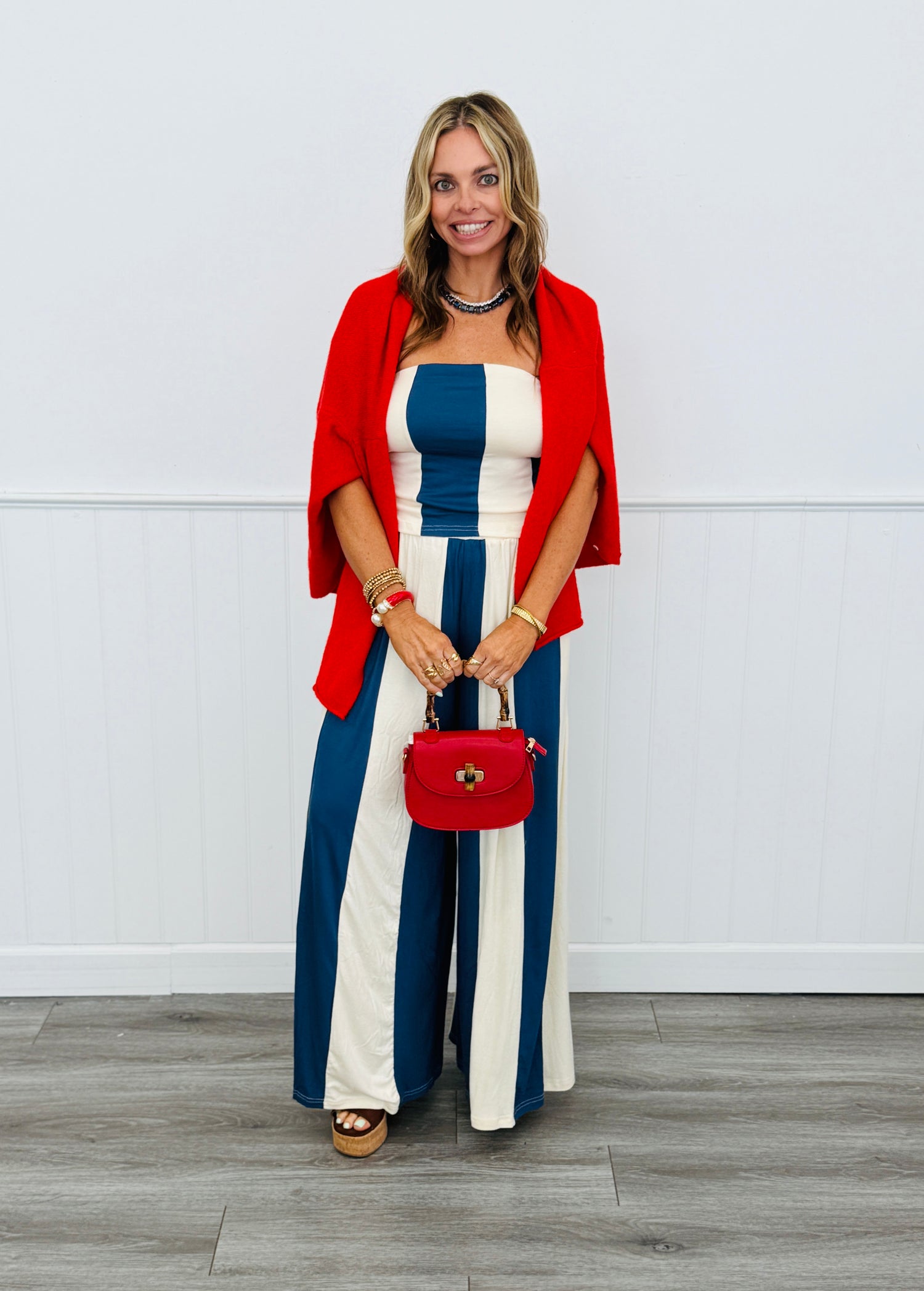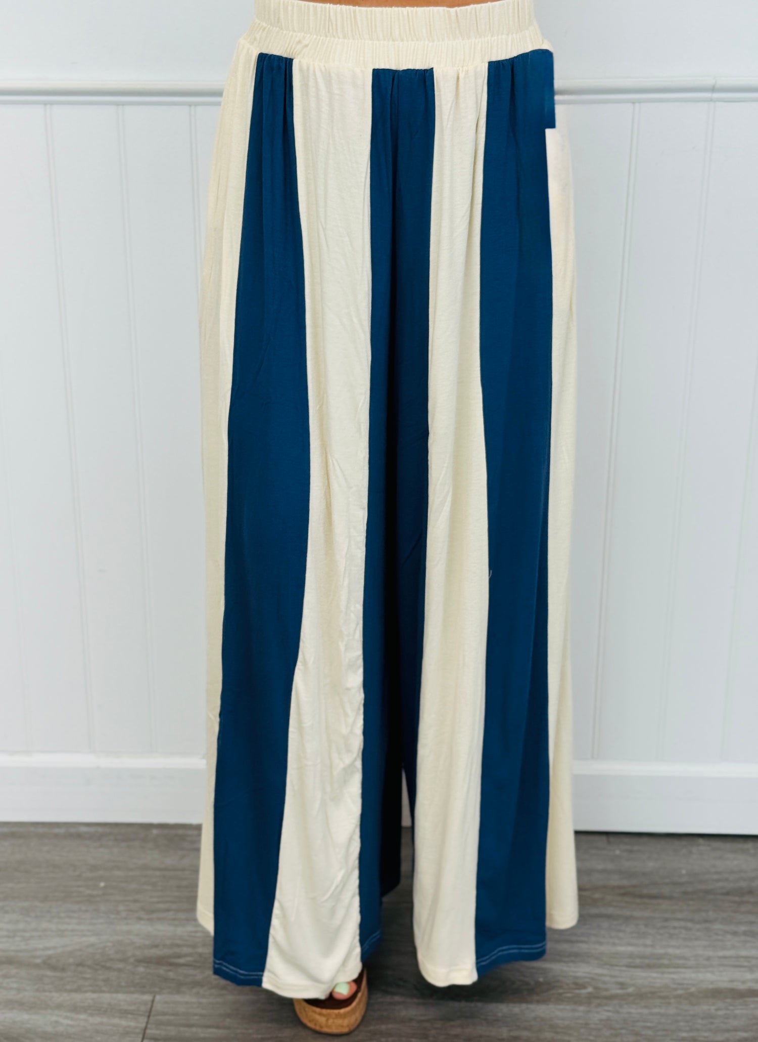 Enjoy your fun in the sun wearing these super cute Navy/White Stripe Havana Pants. Featuring a stretchy waistband, side pockets, pleated flowy legs and bold stripes. Perfect worn with solid tops or with matching tube TOP12618.