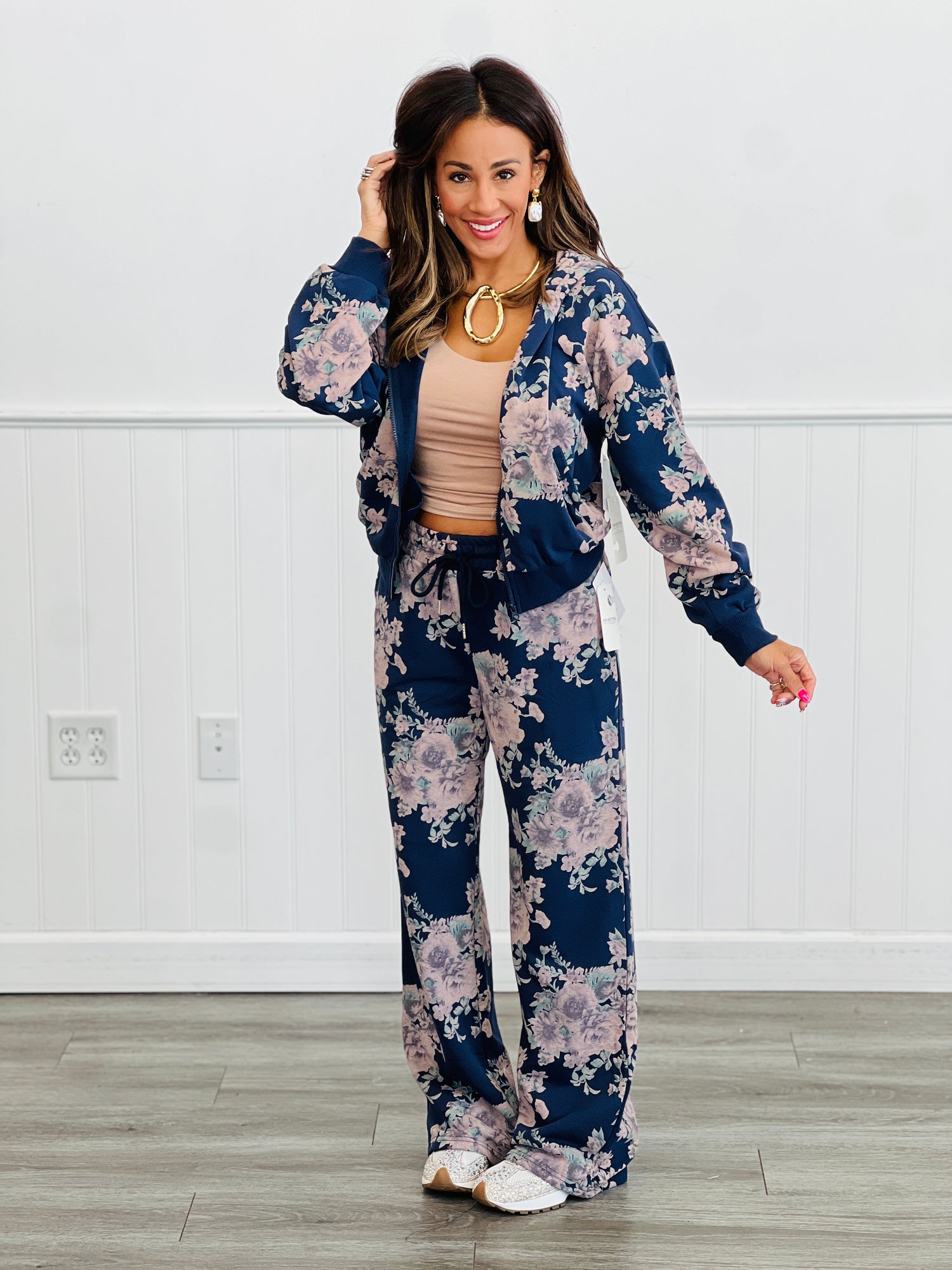 Introducing the cute and comfy active Navy Floral Print Hoodie Jacket. This fun and functional jacket features a navy blue background with a pink floral print, front zip-up closure, contrast banded cuffs & hemline, attached hoodie, front pockets and jersey knit fabrication. Perfect match to active pants BOT6387.
