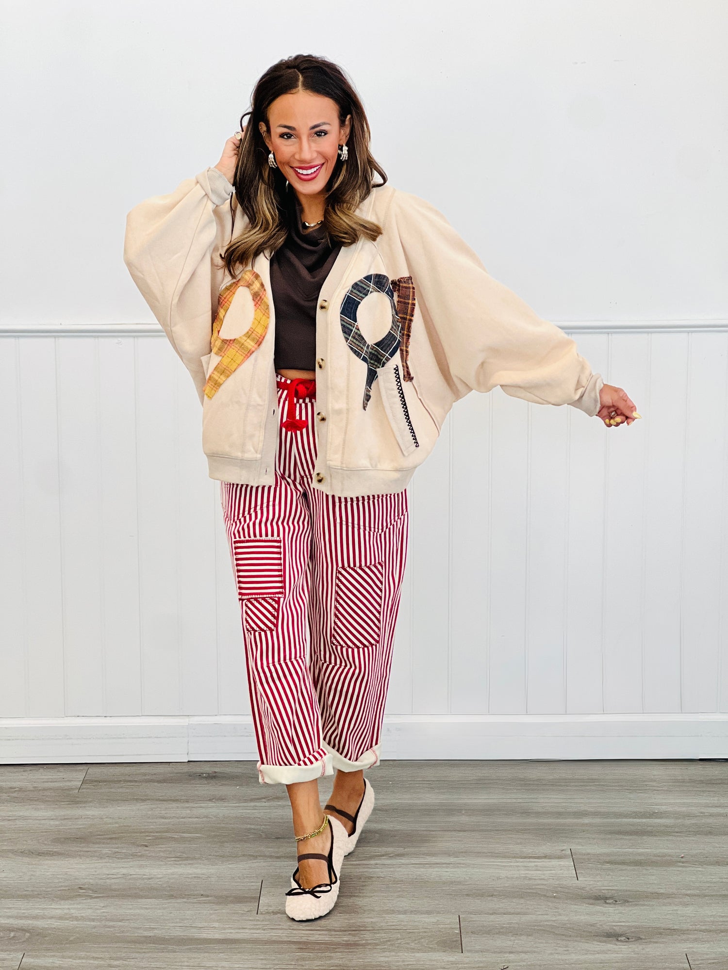 Introducing our on-trend Striped Twill Barrel Pants! These super cute pants feature barrel legs, front and back pocket, cargo pockets, button closure and a braided belt at waist that threads through grommets.