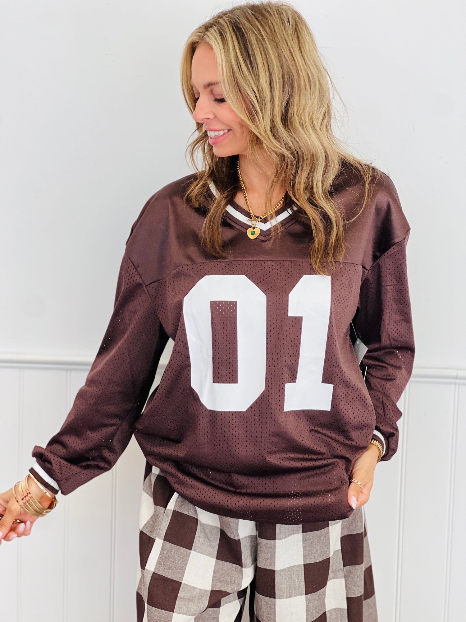 Introducing the Number 01 Long Sleeve Graphic V-Neck Top. This long sleeved top features a v-neckline, regular length and the number "01" patch on the front.