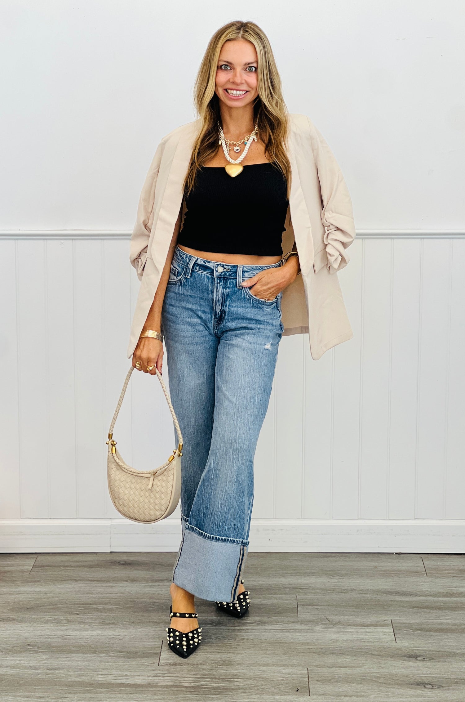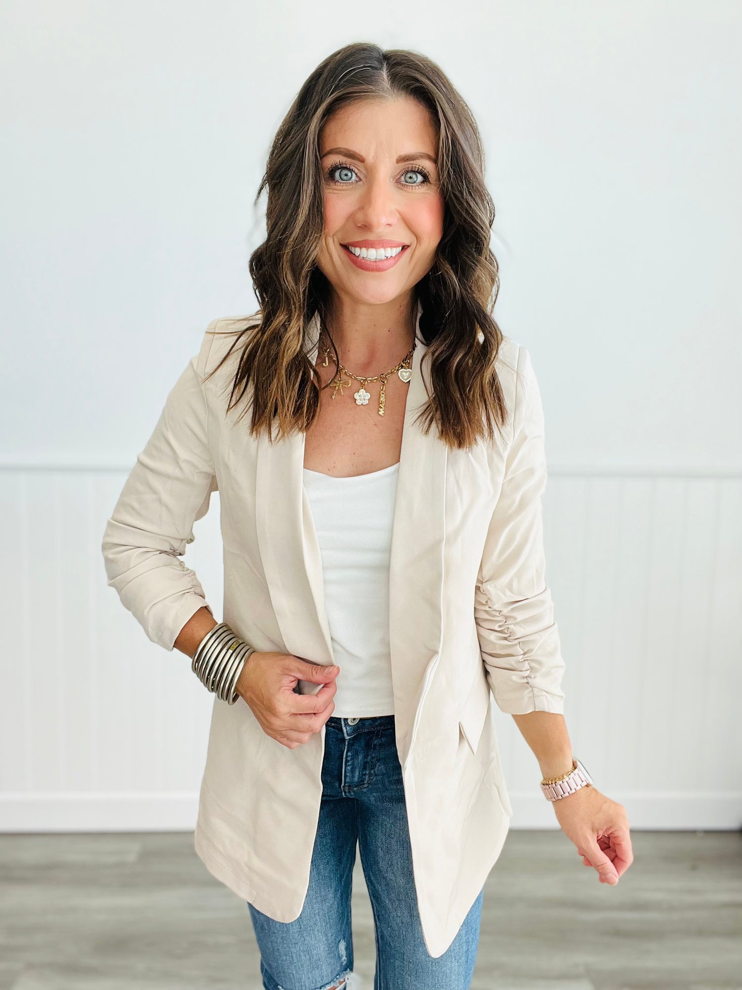 The super cute Ruched Shawl Collar Blazer features a modern contemporary cut, ruched sleeves, open front, shawl collared neckline, flap pockets and true-to-size fit.
