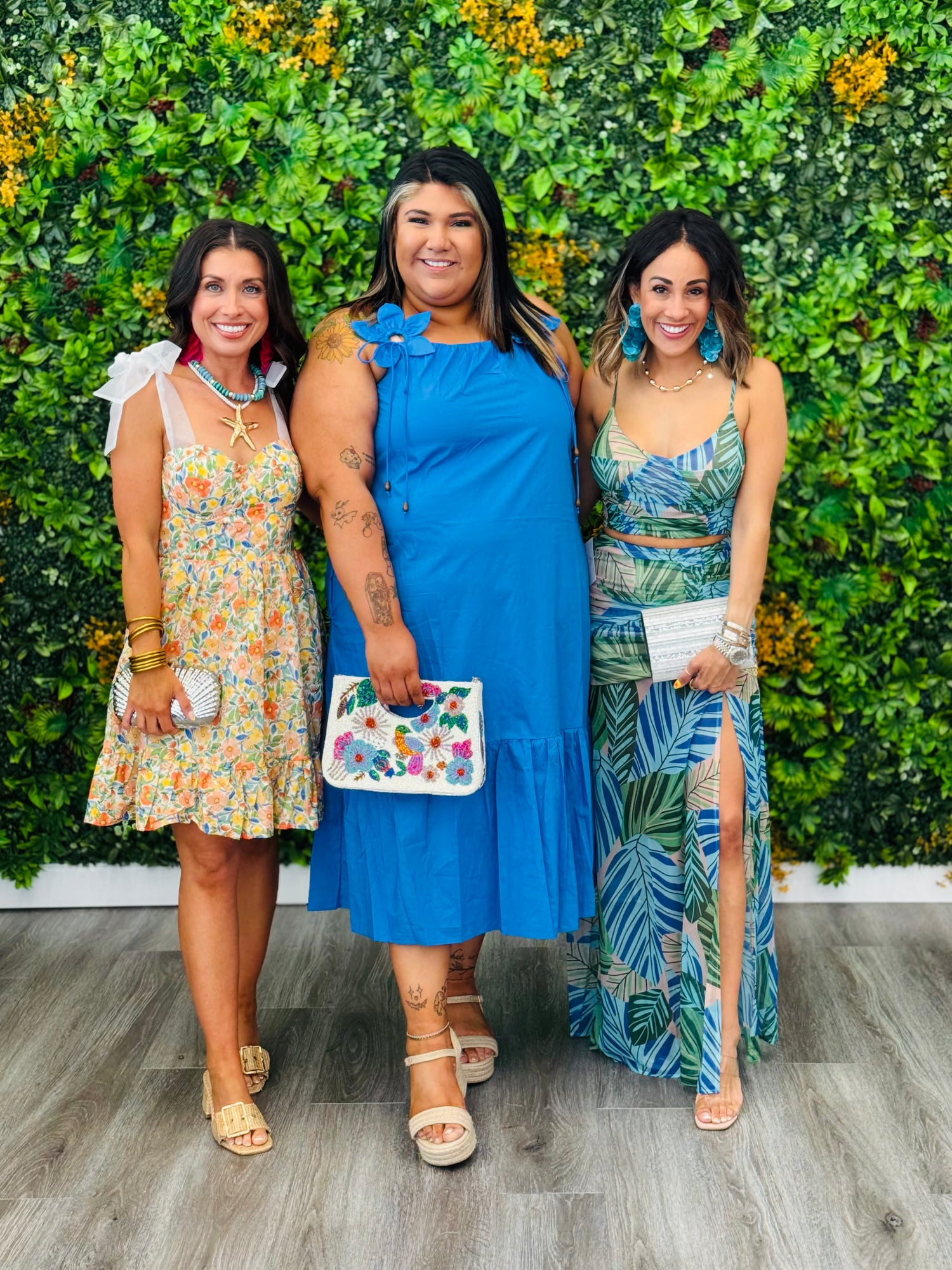 Super cute ocean blue midi sundress for daytime fun or casual evenings. Features include a square neckline, wide straps with an open 3-D floret complete with beaded drawstring, wide ruffled hemline and side pockets. Relaxed fit silhouette.