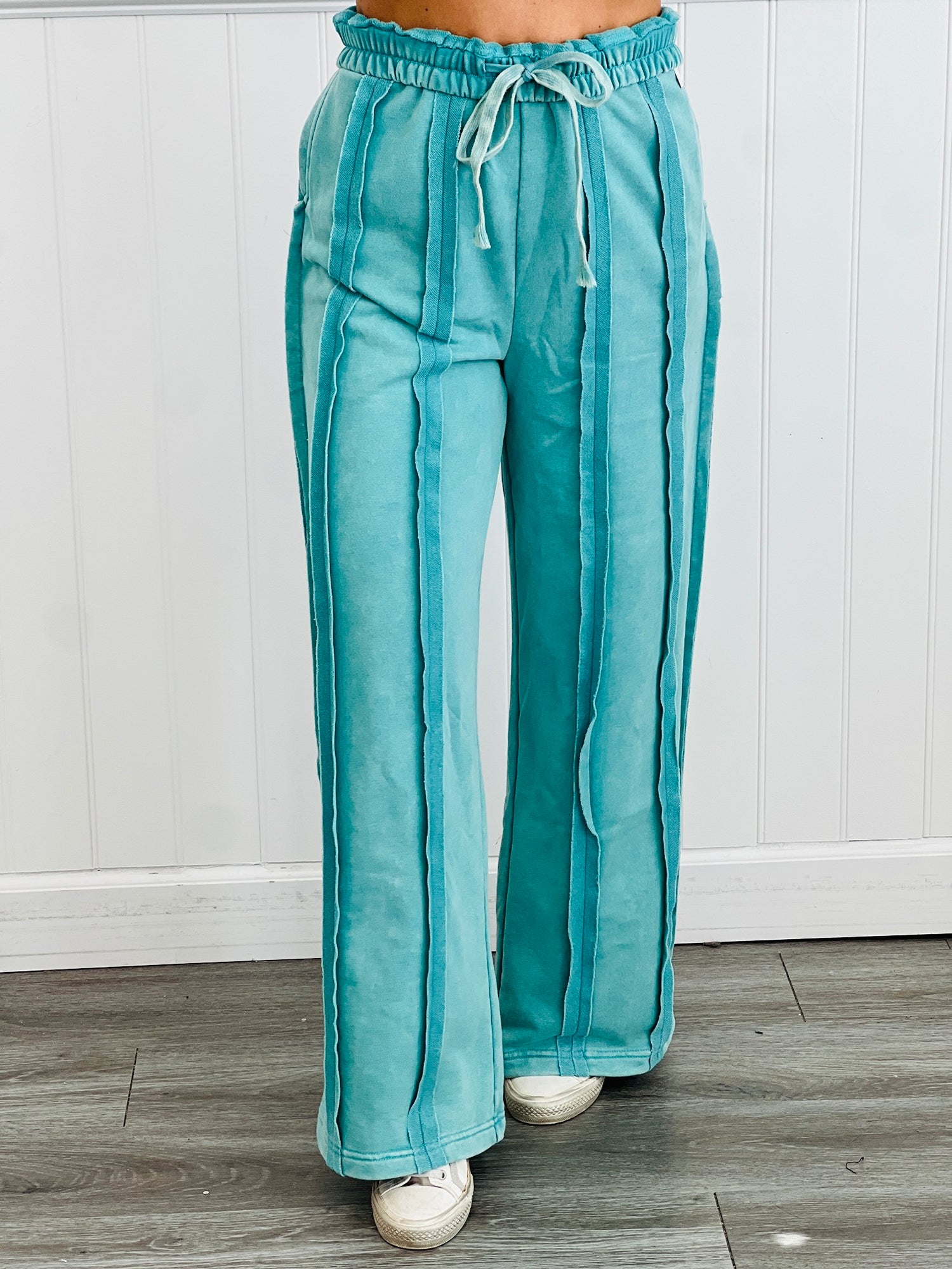 Get cozy and cool in the Oli & Hali Aqua Seam Exposed Pants! These washed drawstring sweatpants show off exposed seams for an edgy twist on your casual look. The adjustable drawstring waist keeps you comfy while adding a fun, laid-back vibe to your outfit. Perfect for lounging or stepping out in style!