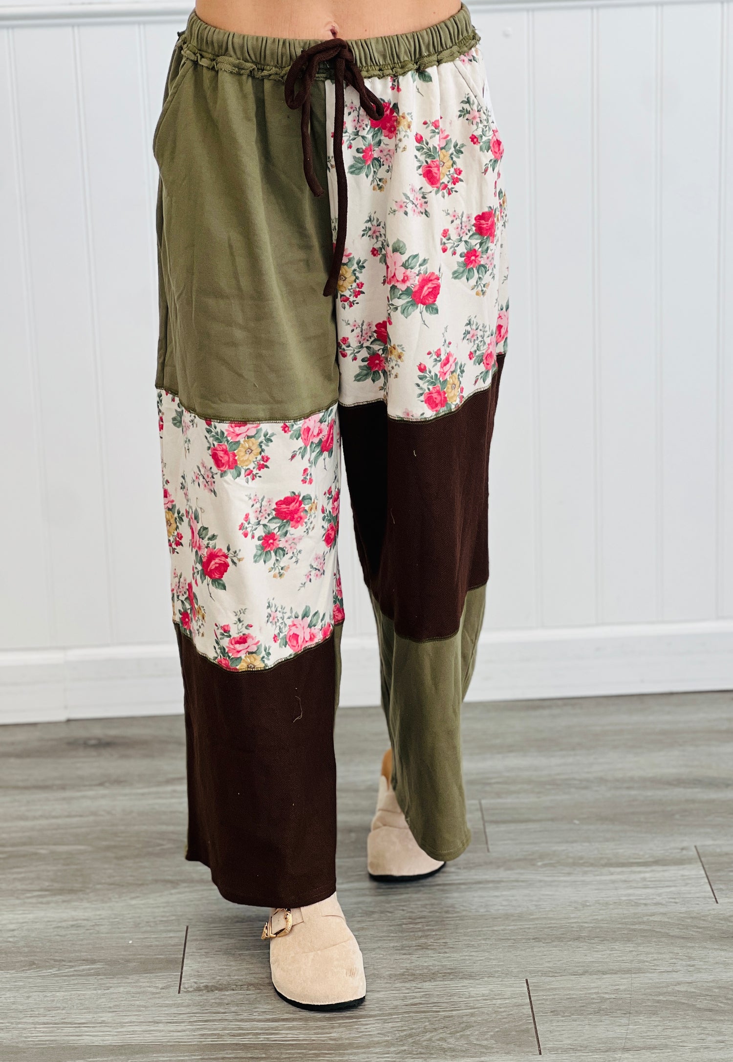 Bring a fun interesting element to your casual days with these Olive/Brown Color Block Pants. Featuring a comfy elastic drawstring waist, wide legs, solid and floral blocks and handy side pockets, they offer easy wear and practical storage. Whether lounging at home or out on the town, these playful pants add a bold pop to your relaxed style. Perfect match to TOP11648.