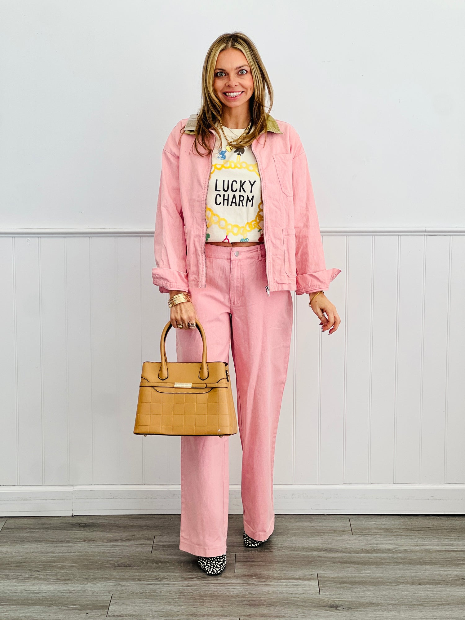 Introducing the fabulous Pink Denim Elastic Back Jeans. Featuring a front button & zipper zipper closure, elastic back waistband, front & back pockets, straight relaxed legs and regular size fit. Perfect match to pink denim utility jacket CAR3590.