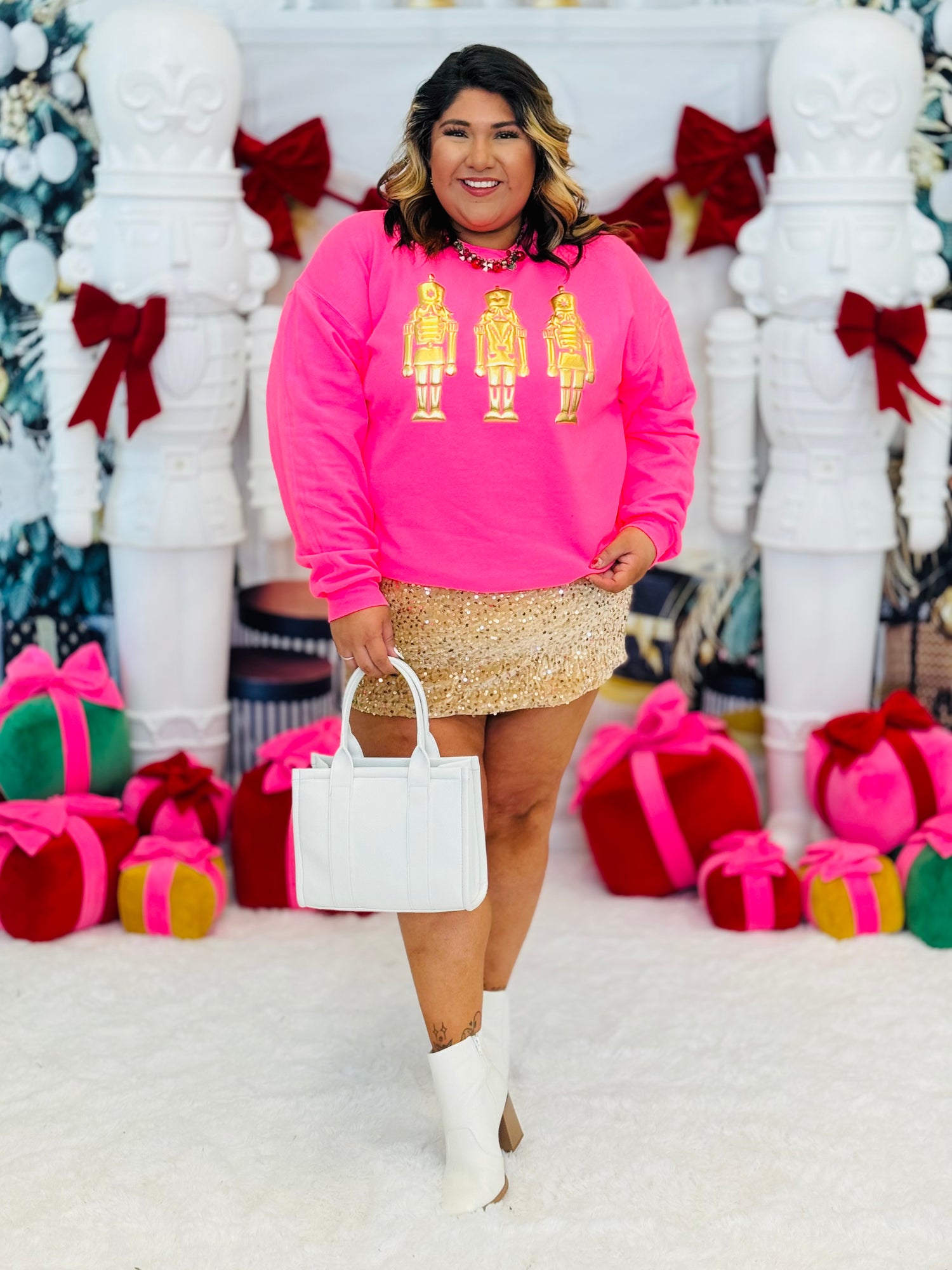 Celebrate the holiday spirit in style with this Pink Metallic Puff Nutcracker Sweatshirt! Featuring three shimmering gold nutcrackers, it adds a festive and fun touch to your cozy wardrobe. Perfect for lounging or holiday gatherings, its playful design and comfortable fit bring cheer and warmth to any occasion.