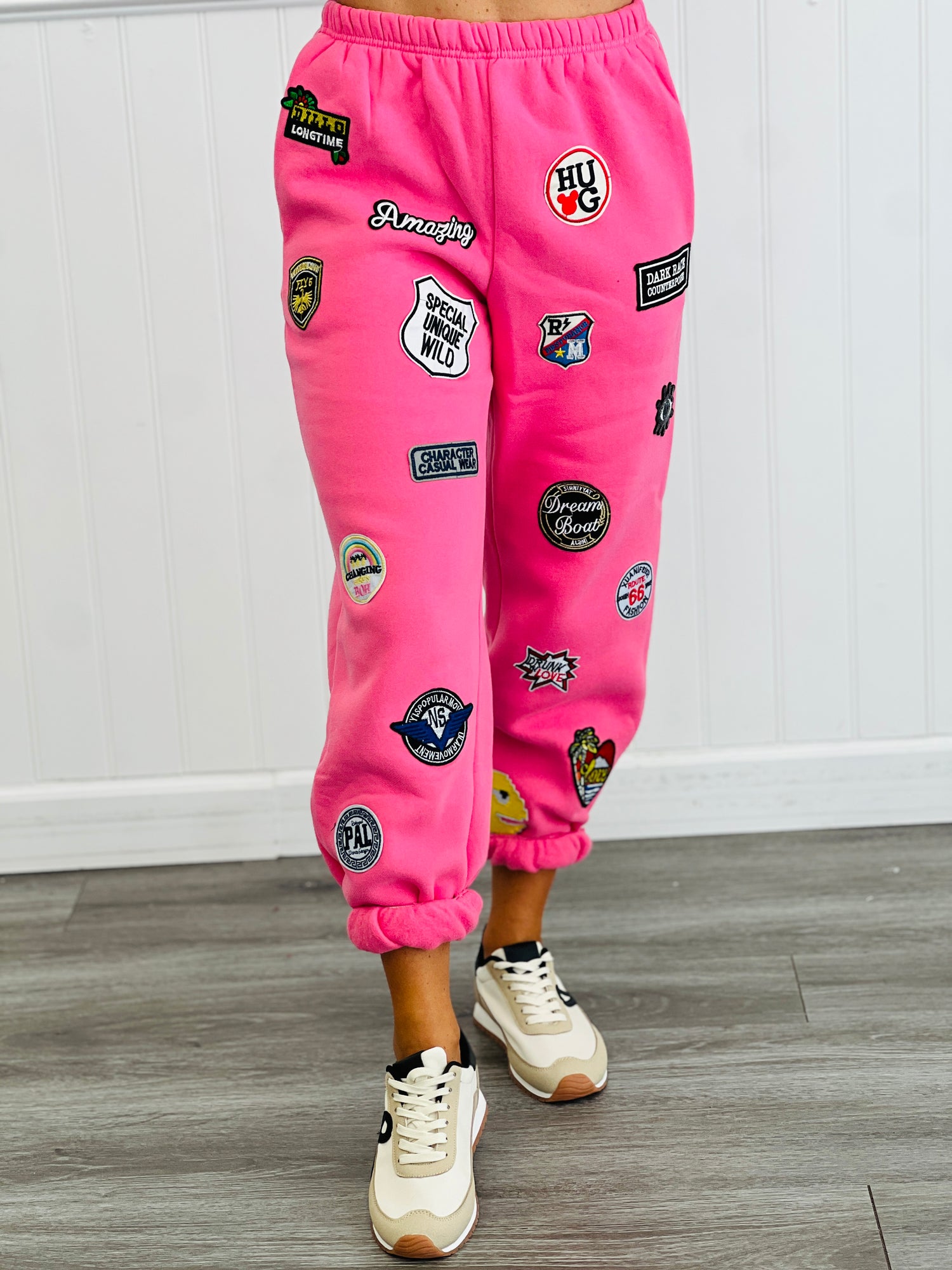 Super cute and uniquely fun and functional high waisted fleece joggers feature an elastic waist, elastic cuffs, side slant pockets and a variety of multi-colored patches.